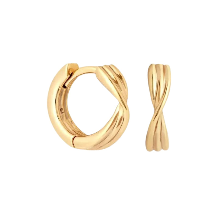 These huggie hoop earrings are made with a 100% recycled sterling silver base and a thick layer of 14K gold plating. They feature a crisscross design and are waterproof and tarnish-free.