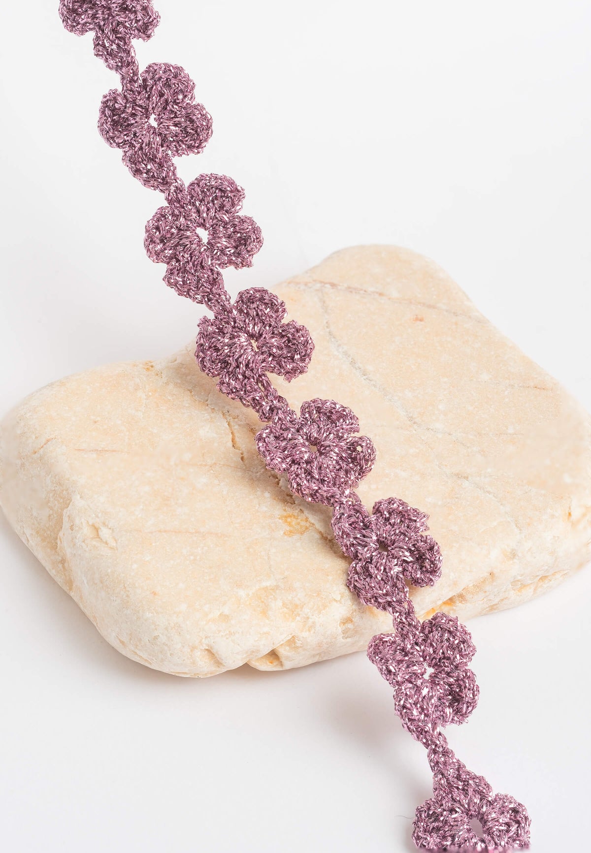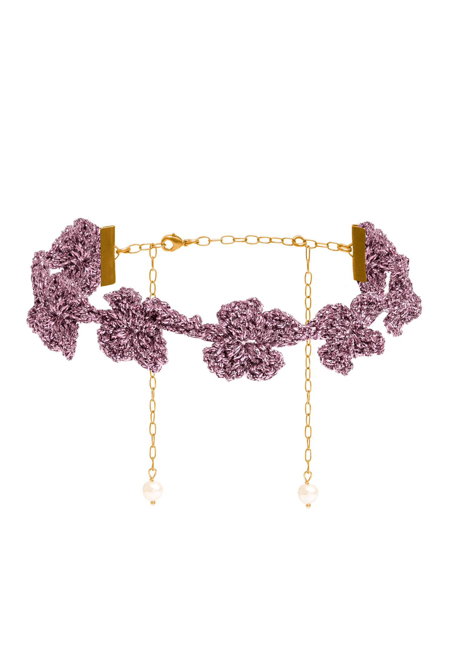 The Binibeca Mauve Flower Choker by Lavani Jewels is an exclusive and romantic accessory. Inspired by a sunset garden, this choker features embroidered flowers in soft mauve tones. Delicate golden chains with dangling pearls gently brush the skin. This piece is a beautiful reminder that true beauty lies in freedom and uniqueness. It is also hypoallergenic and nickel-free.
