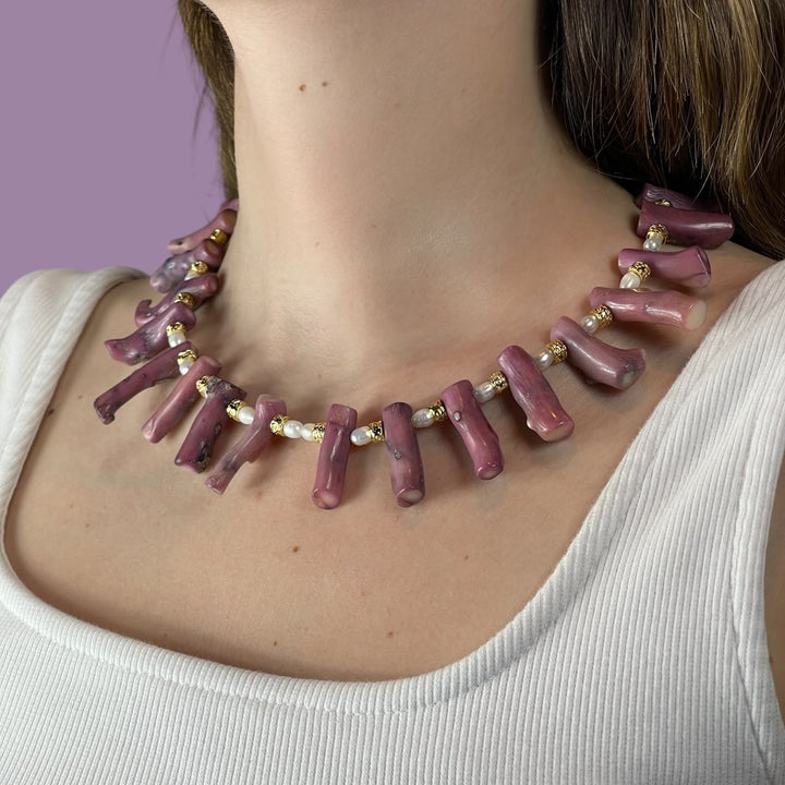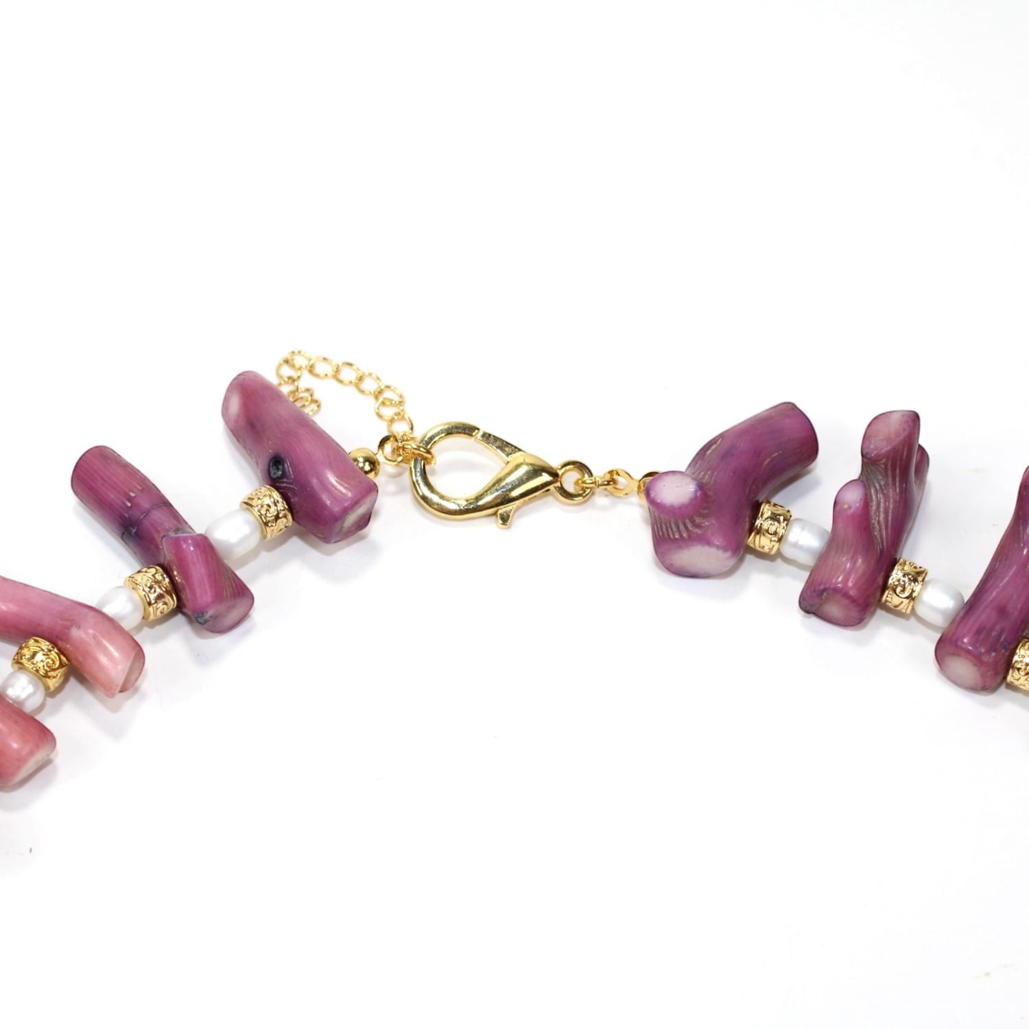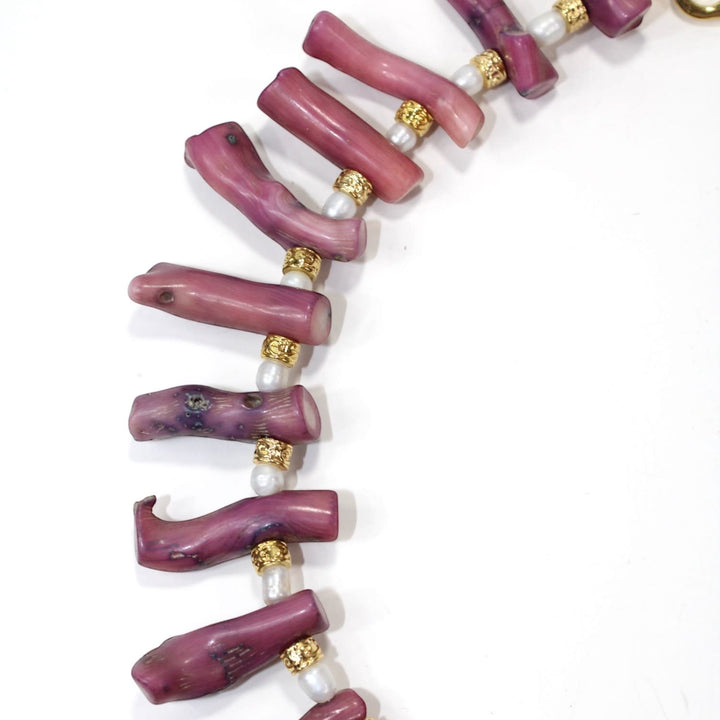 Coral, genuine freshwater pearls, and gold-plated brass. Length: approx. 42–47 cm.