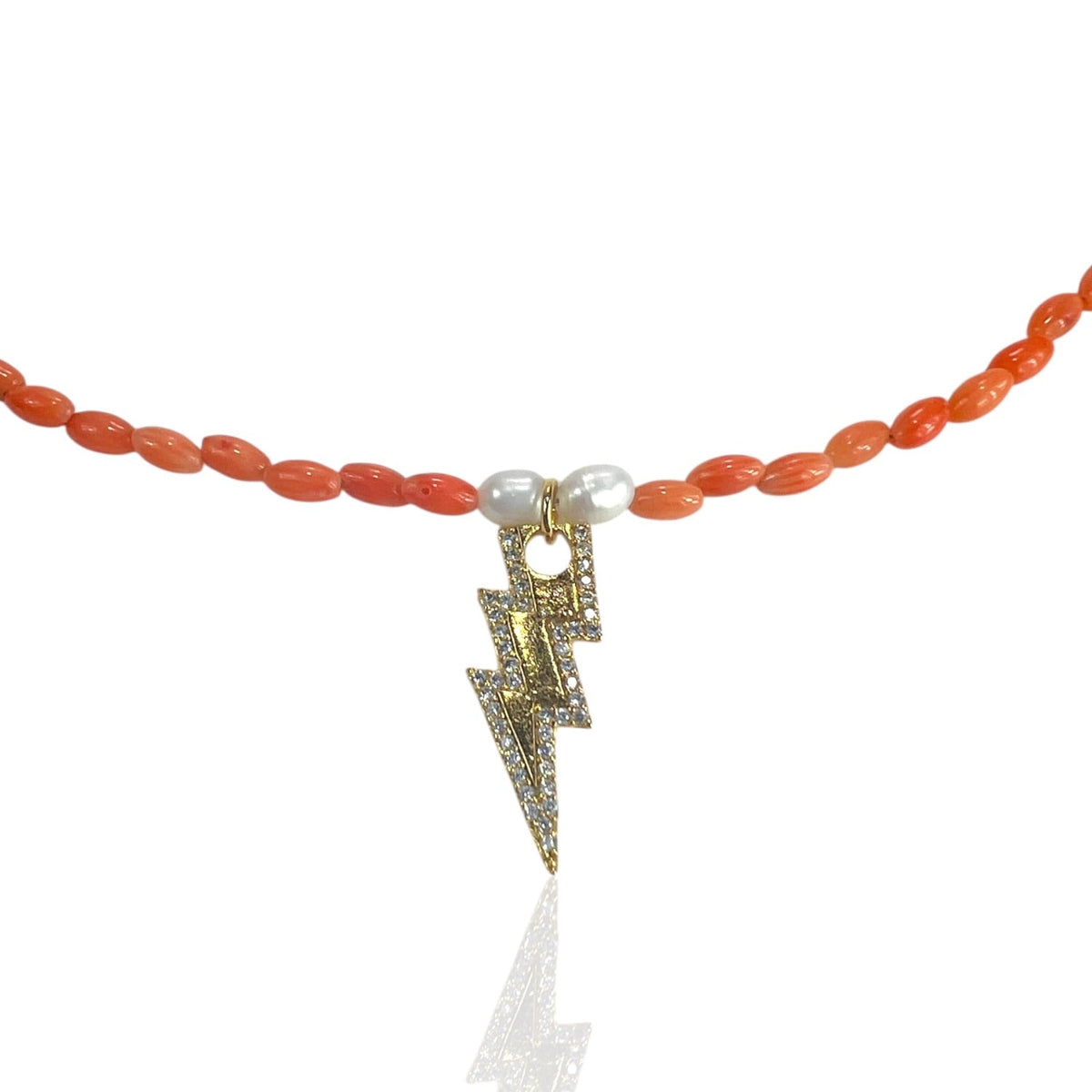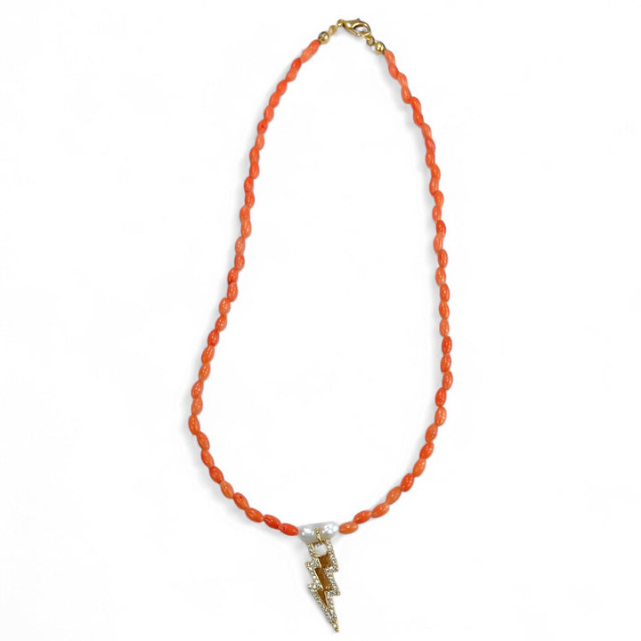 This necklace is handmade with natural coral, genuine freshwater pearls, and gold-plated brass.