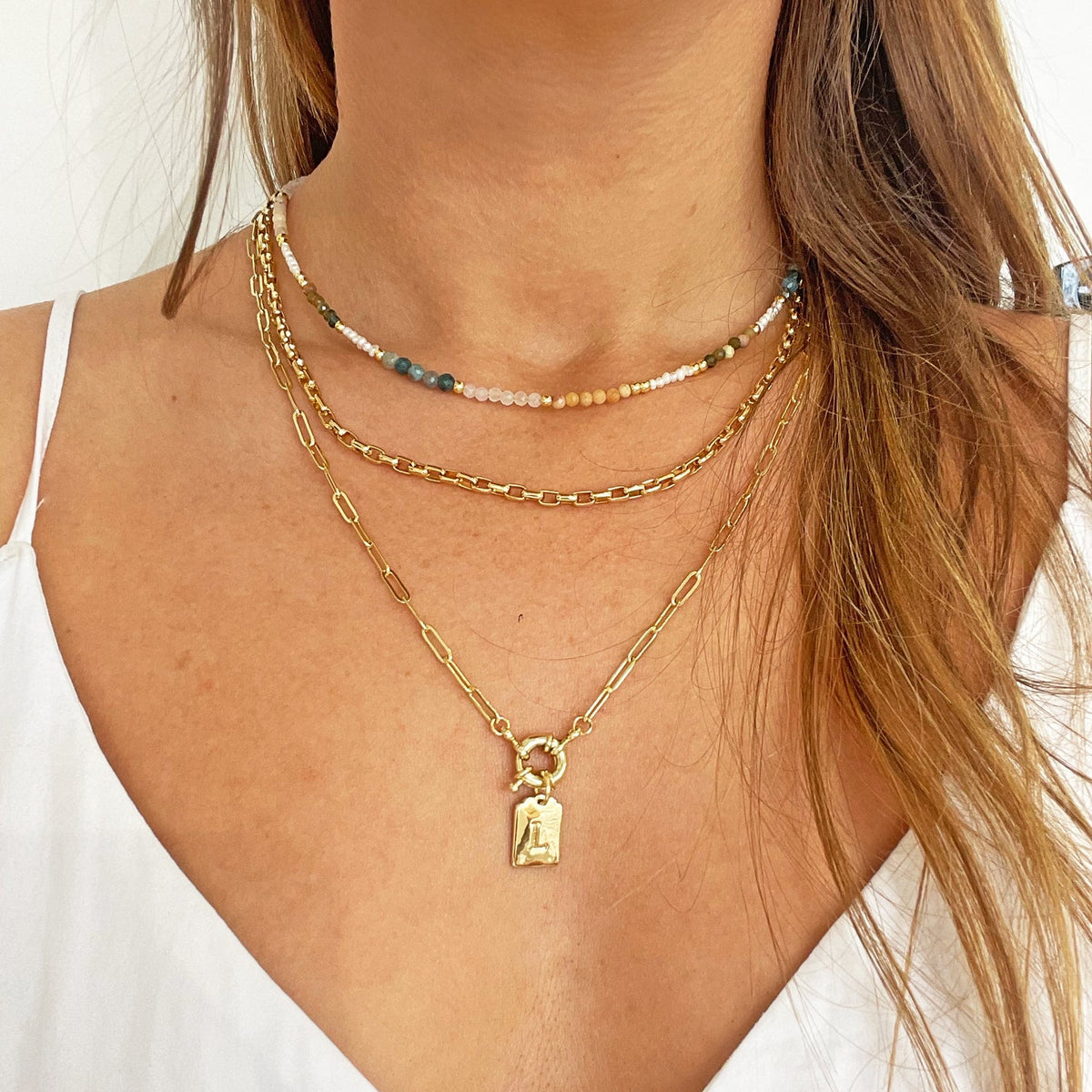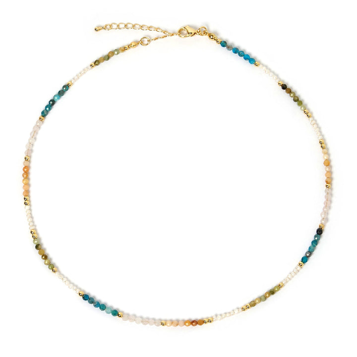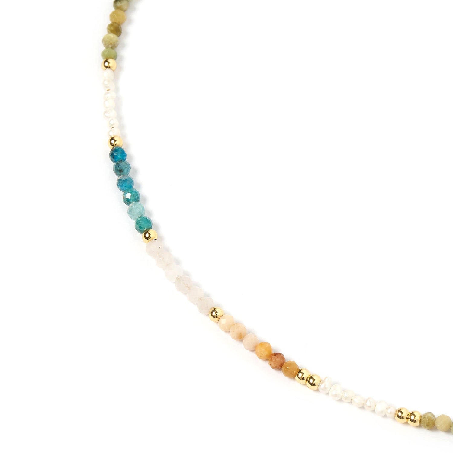 This necklace is made with a 2-micron 18k gold plating and an e-coating. It features colorful gemstones and gold beads. It is also 100% nickel and lead-free.