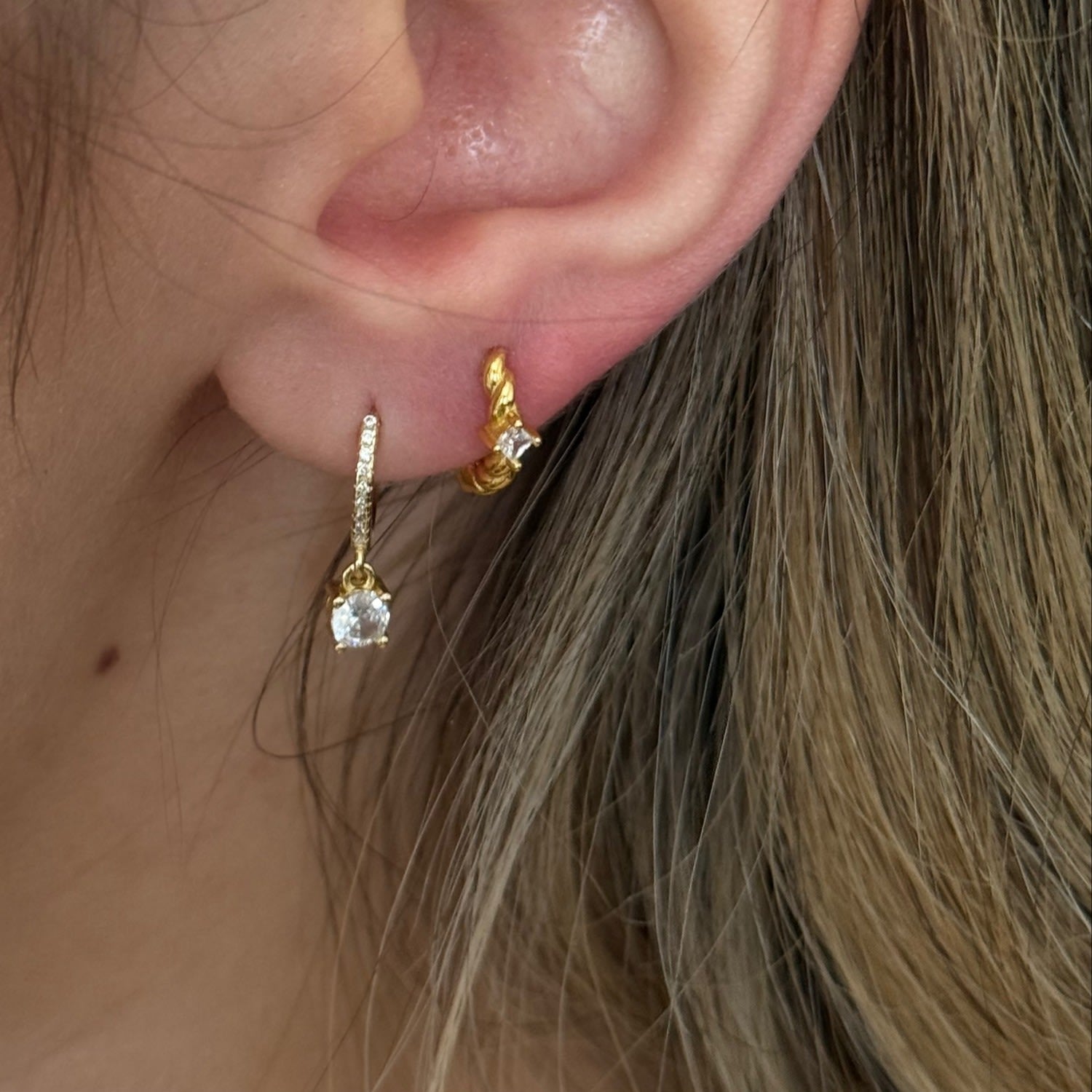 These earrings are crafted from a 100% recycled sterling silver base with a thick layer of high-quality 14k gold plating. They feature cascading zirconia stones and are waterproof and tarnish-free.