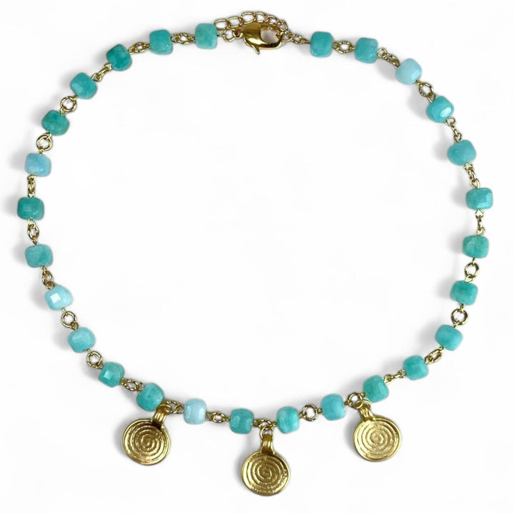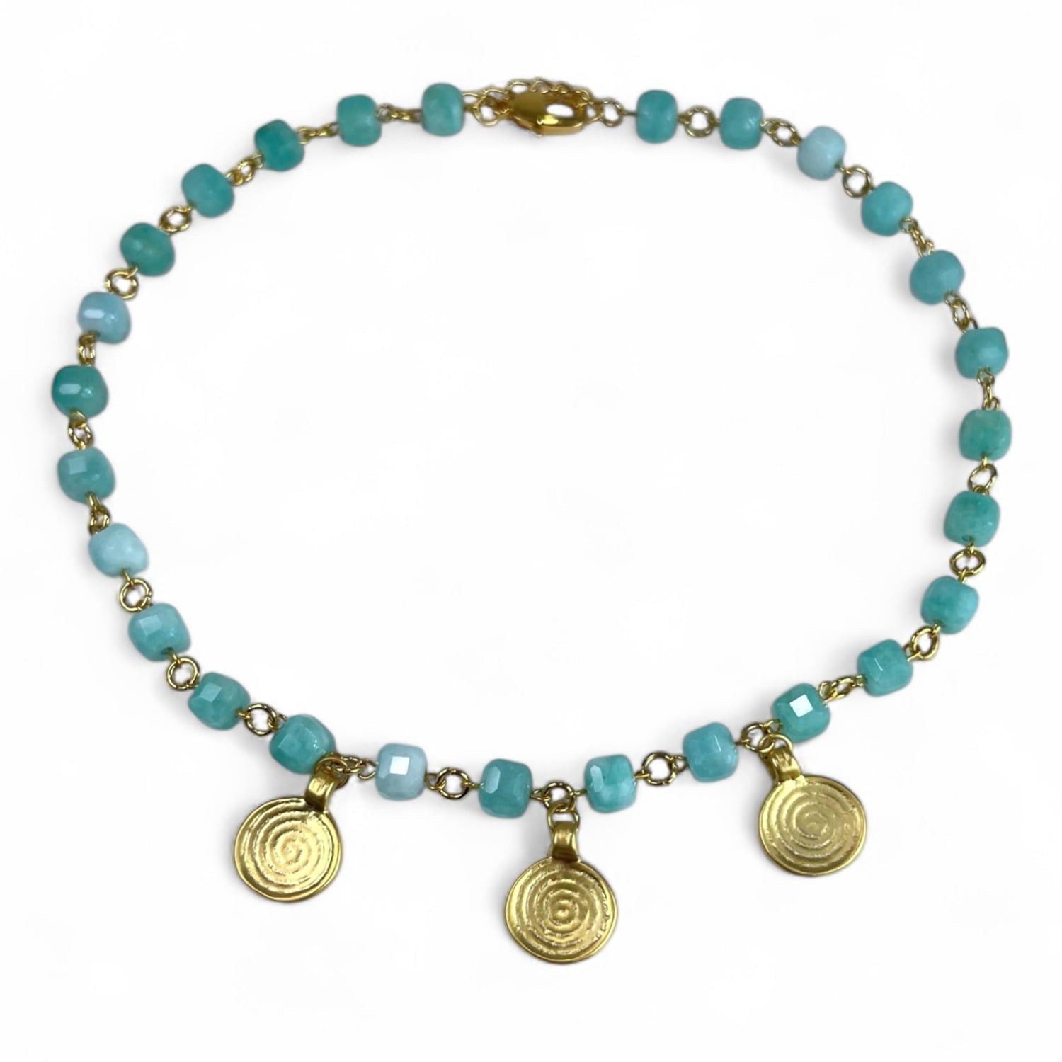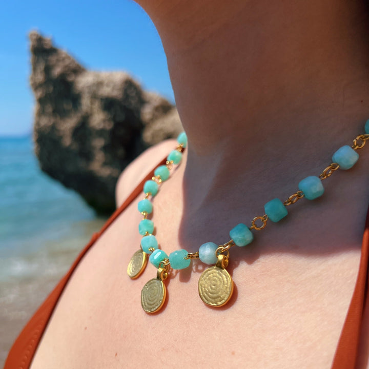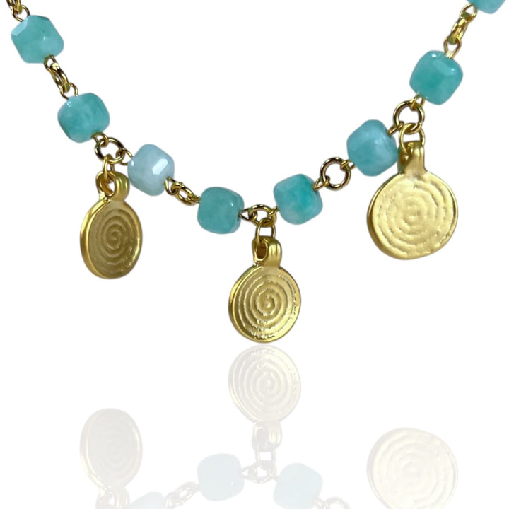 This necklace is made with natural aquamarine stone and gold-plated brass. It is a single necklace.