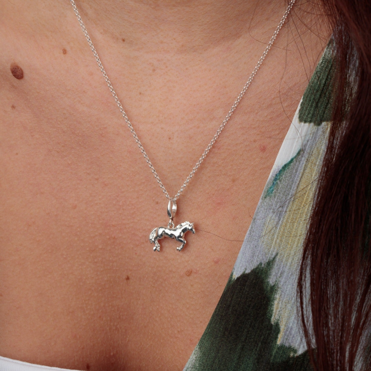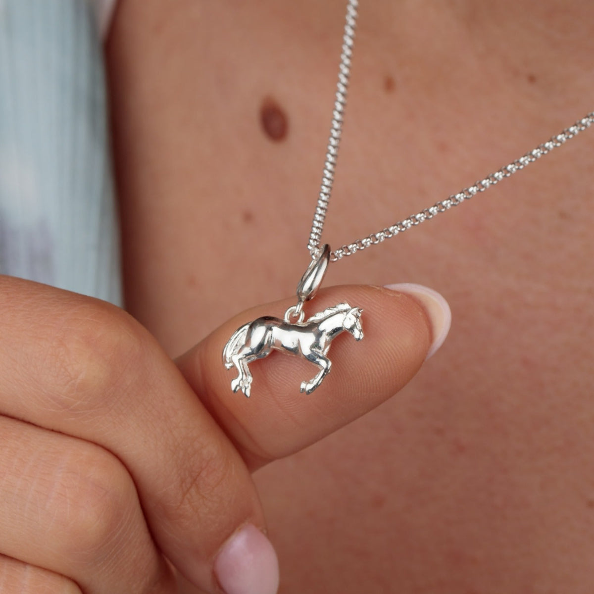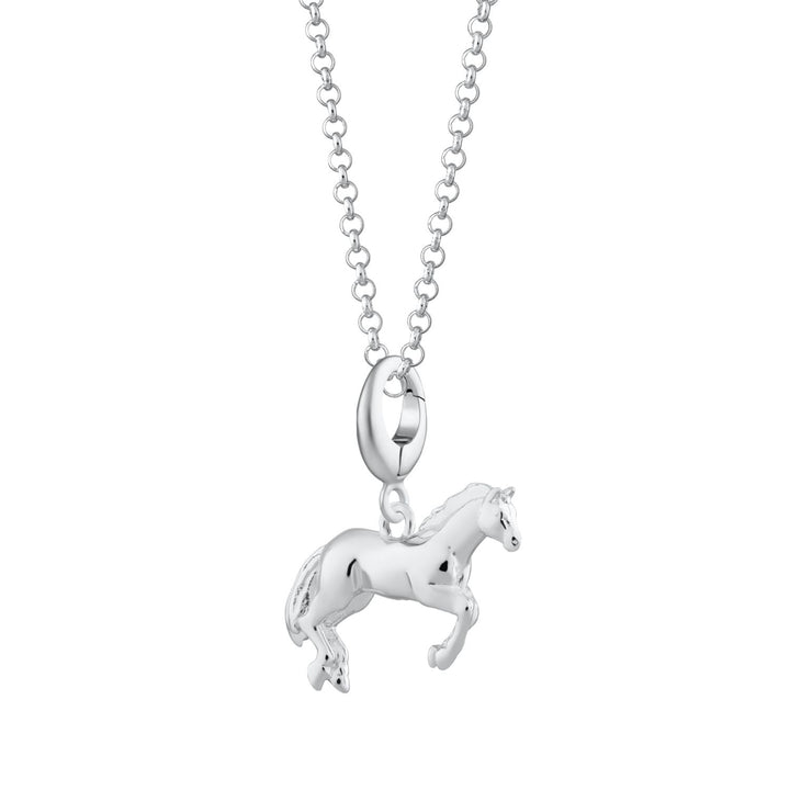 The Sterling Silver Horse Charm Necklace by Lily Charmed captures the spirit of freedom. Crafted from high-quality recycled 925 sterling silver and plated with rhodium, this necklace features a beautifully detailed 3D horse charm. It is a timeless and elegant piece that is perfect for horse lovers or as a thoughtful gift.