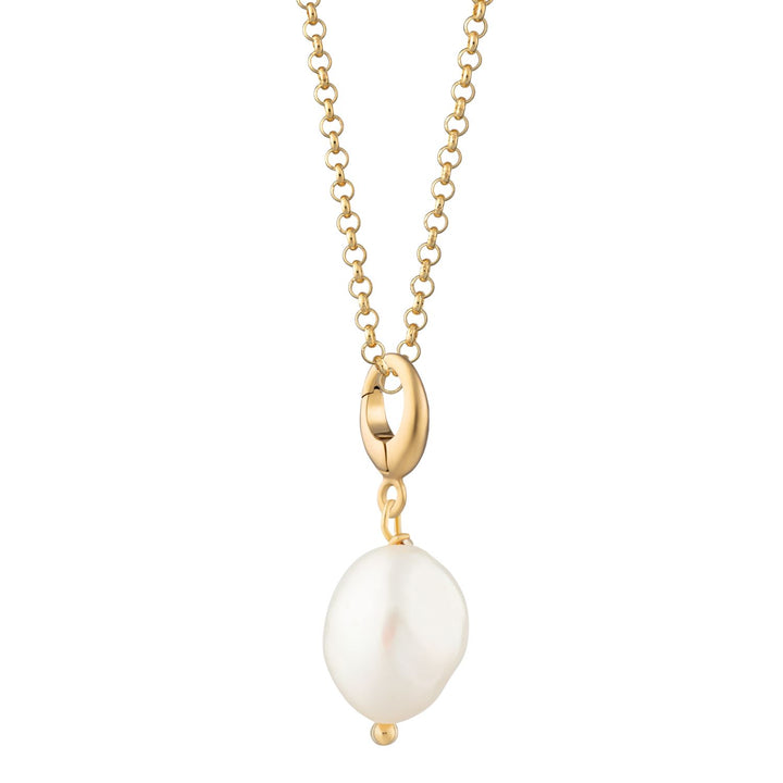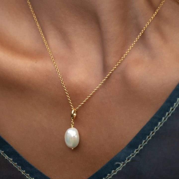 Crafted from 18ct gold-plated recycled sterling silver. Features natural baroque pearl pendant. Suspended from a belcher chain with clip-on clasp.