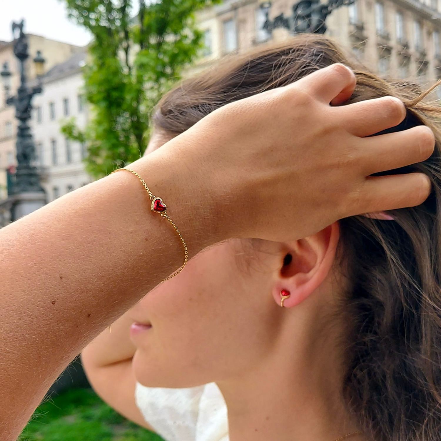 Fully plated in 23k gold. Features deep red enamel heart with golden dot detailing. Chain length 38 cm with 5 cm extension.