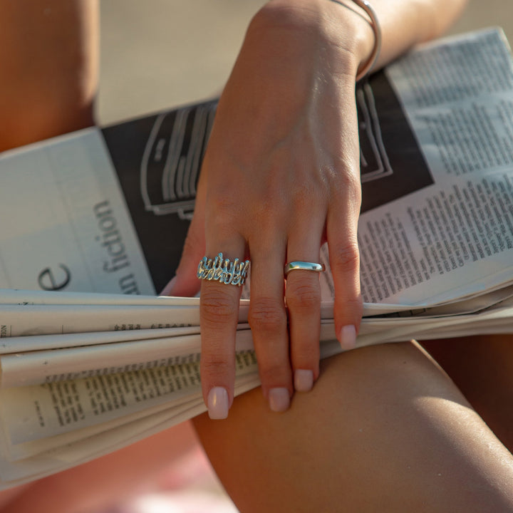 This Dripping Large Melting Silver Ring by Mejoma is a unique and artistic statement piece that redefines modern elegance. Its distinctive "dripping" design gives it a fluid, sculptural quality, making it a standout accessory. This ring is perfect for those who want to elevate their everyday style with a touch of sophistication and originality. It's a bold and confident piece that adds a unique artistic flair to any outfit, ensuring you stand out from the crowd.