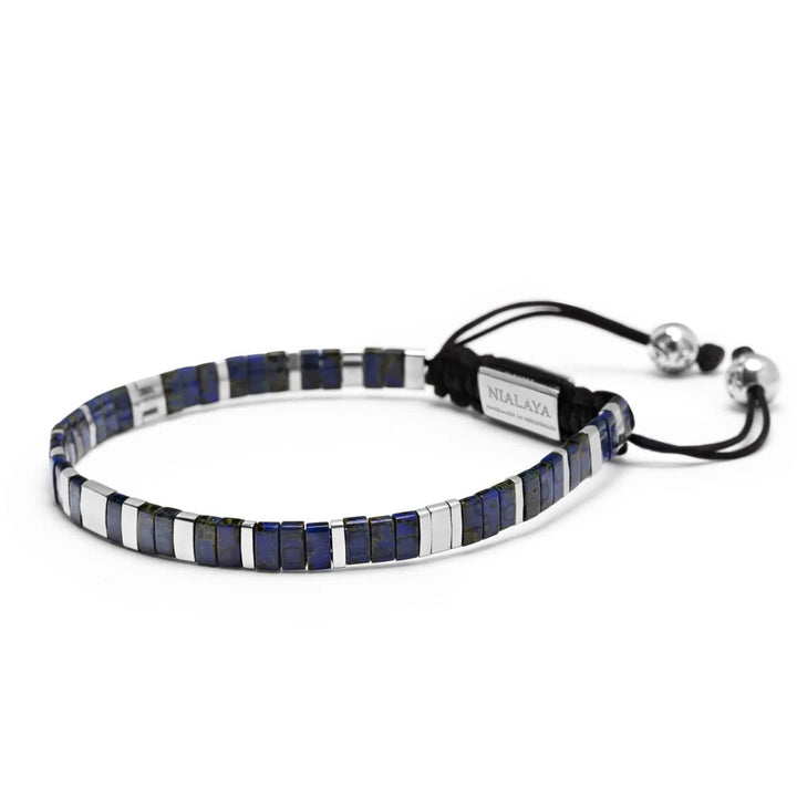 This Women's Bracelet by Nialaya is a captivating piece that features a dance of blue and silver. Each glass bead is a testament to the fusion of craftsmanship and sophistication, with intricate hand-painted details. The deep blue tones evoke a sense of calm, while the shimmering silver accents add a touch of modern glamour. This one-of-a-kind bracelet is a wearable work of art, perfect for adding an elegant and serene touch to your wrist.