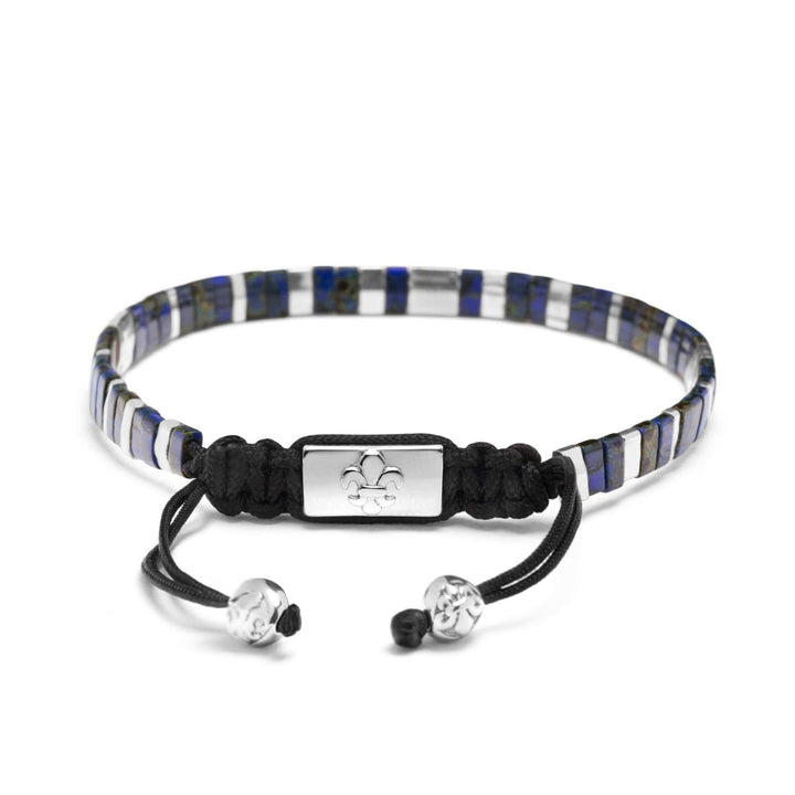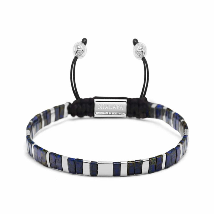 This bracelet is made with a black nylon string and features 5mm hand-painted glass beads in marbled blue and silver Miyuki Tila. It has a stainless steel lock and logo balls.