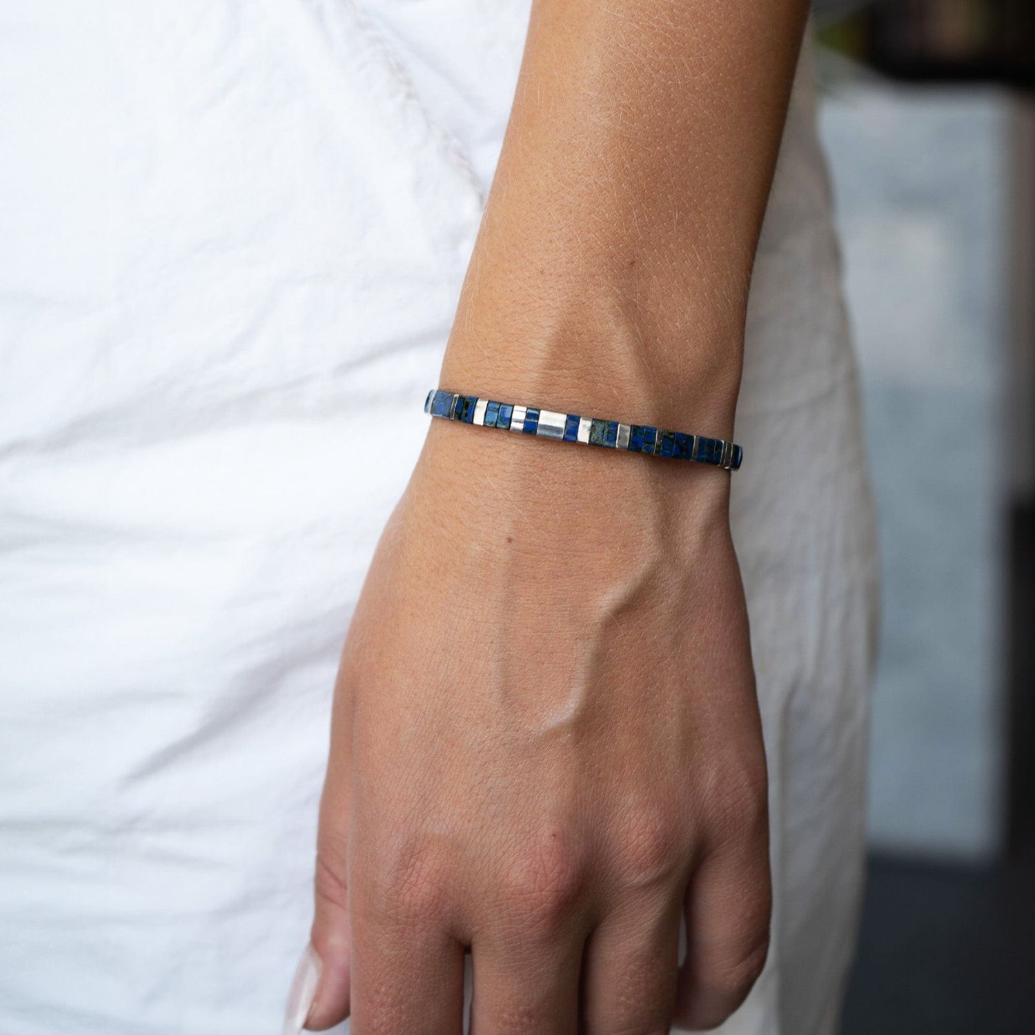 Women's Bracelet With Marbled Blue And Silver Miyuki Tila Beads