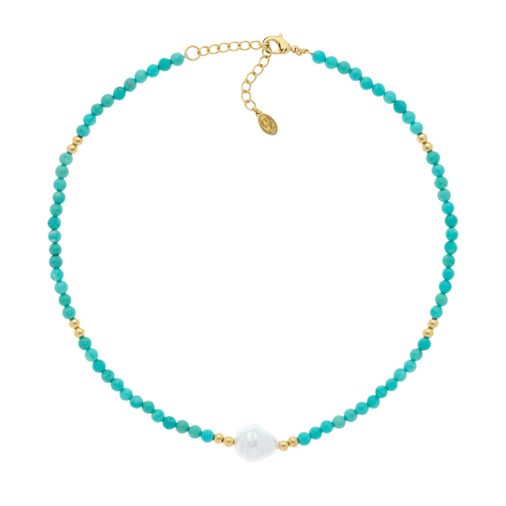 This necklace is crafted with turquoise beads, 24-carat gold plate, and a center baroque pearl. It has a length of 37cm plus an extension and is nickel-free and hypoallergenic.