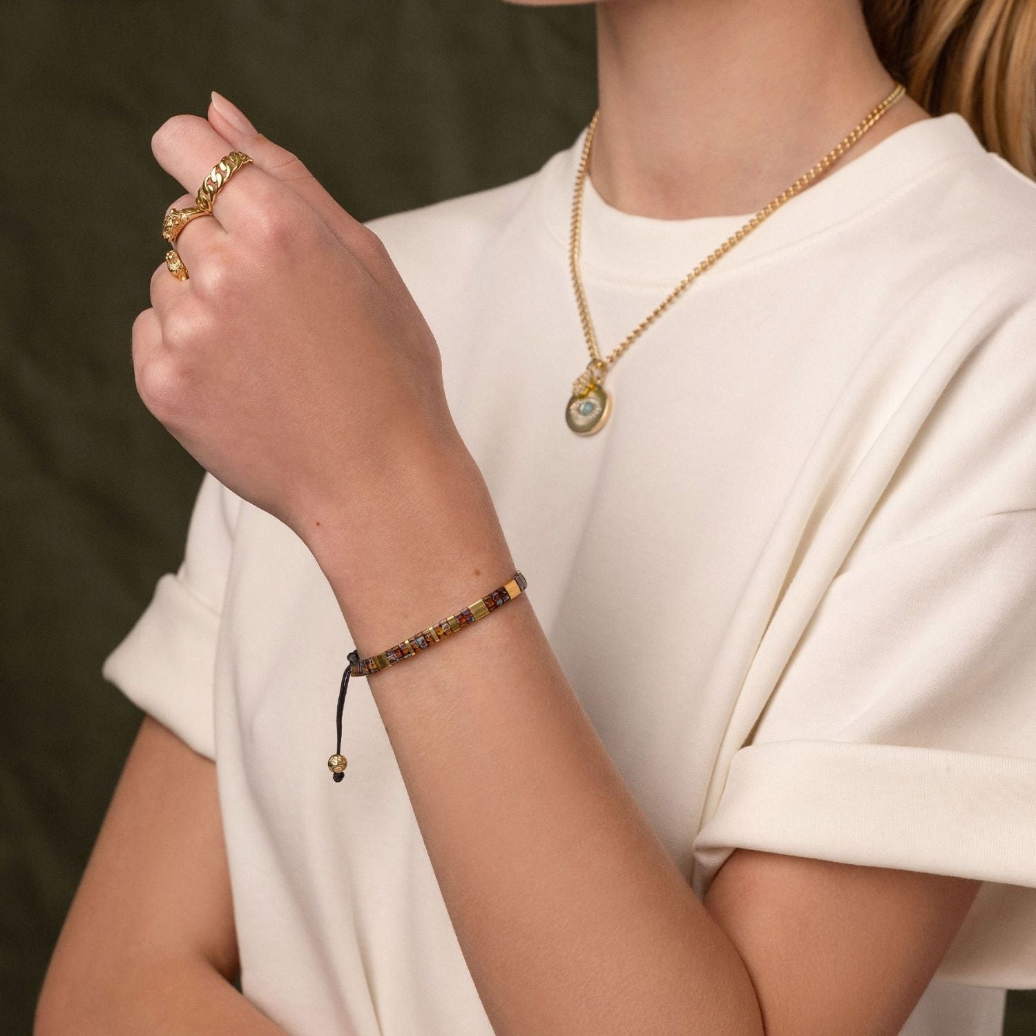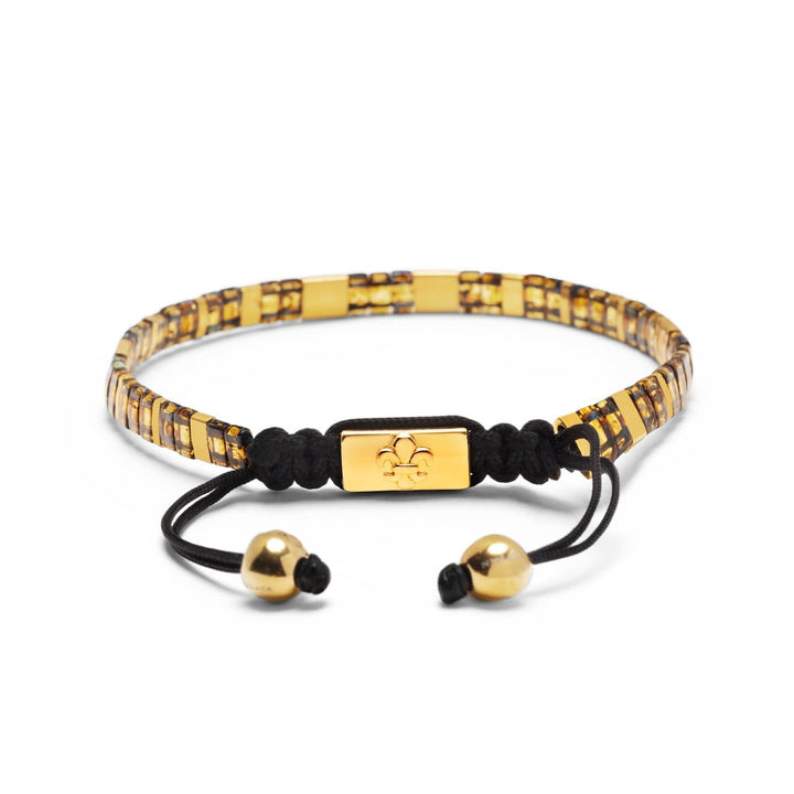 This bracelet is handmade in Los Angeles and features 5mm Marbled Amber and Gold Miyuki Tila Beads. It is strung on a black nylon string with a stainless steel Nialaya lock and logo balls with gold plating.