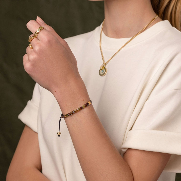 This Women's Bracelet by Nialaya is a radiant tapestry of artistry and sophistication. Each glass bead, adorned with hand-painted details, showcases a harmonious blend of warm amber and lustrous gold. This bracelet is a celebration of timeless elegance, inspired by vintage aesthetics and crafted for those who appreciate the beauty of fine details. Its delicate and intricate design makes it a versatile piece that can be worn alone for a subtle statement or layered with other bracelets.