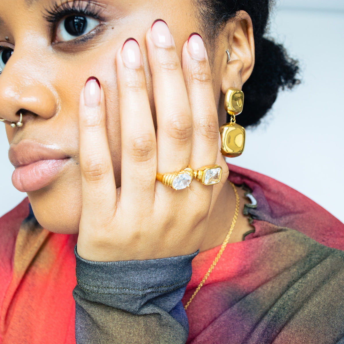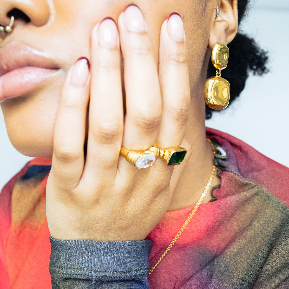 These double-drop earrings are made from 18k stainless steel with a gloss vacuum coating. They are tarnish-free and have a butterfly back.