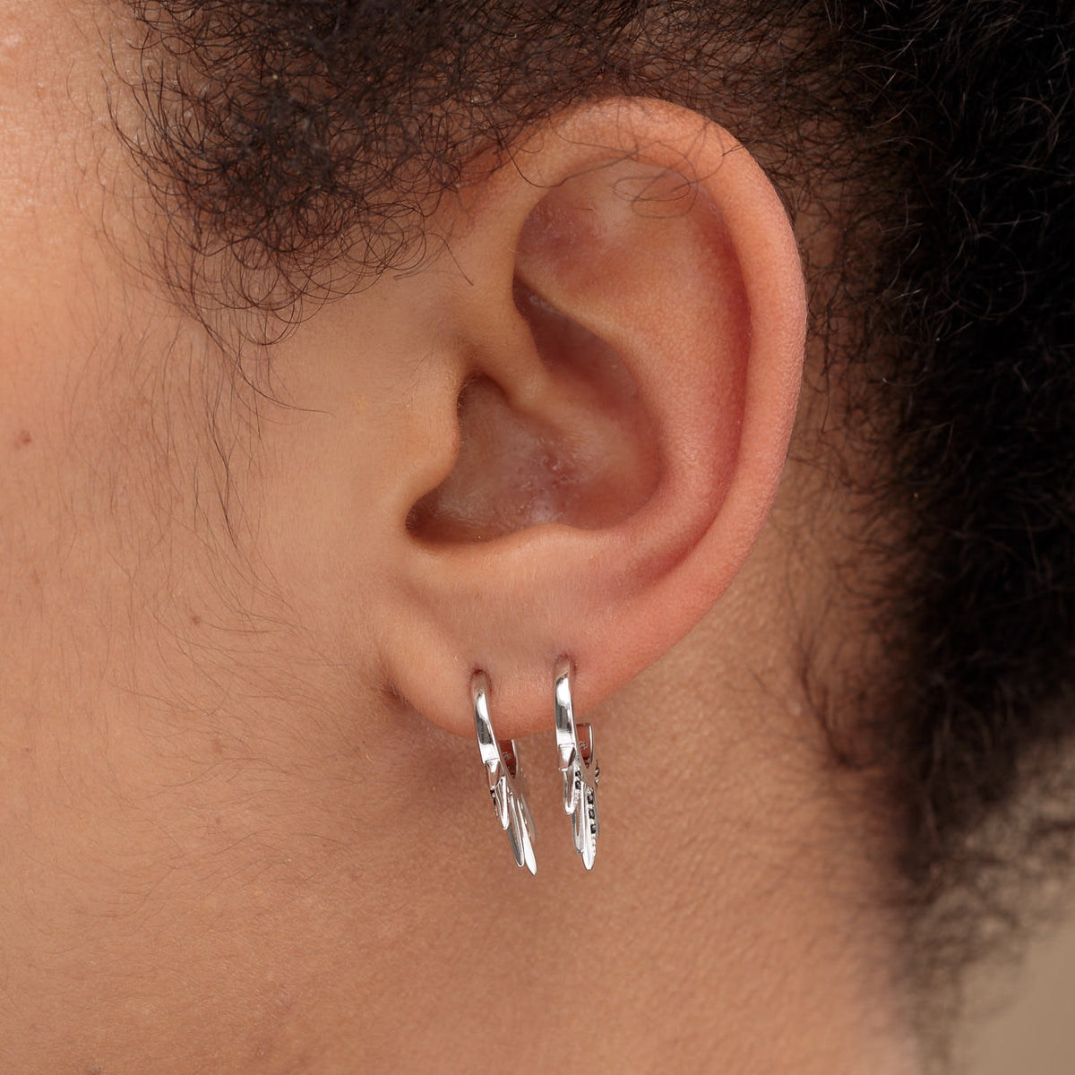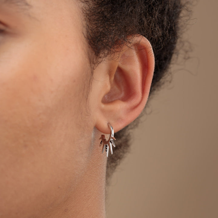 These hoop earrings are made from 100% recycled sterling silver with rhodium plating and black cubic zirconia. They feature sun rays and a spike design.