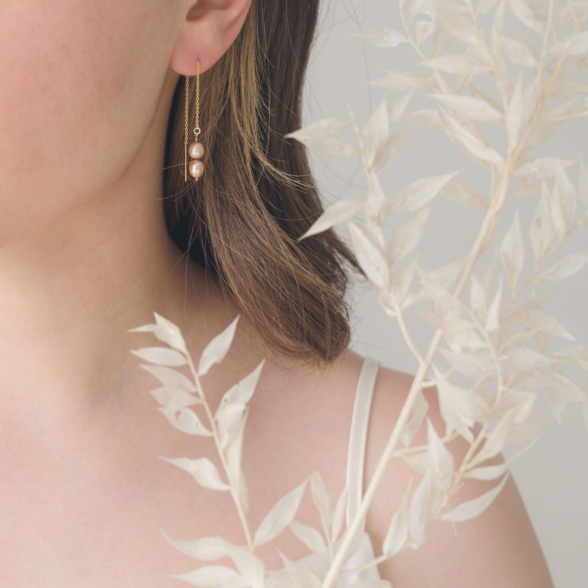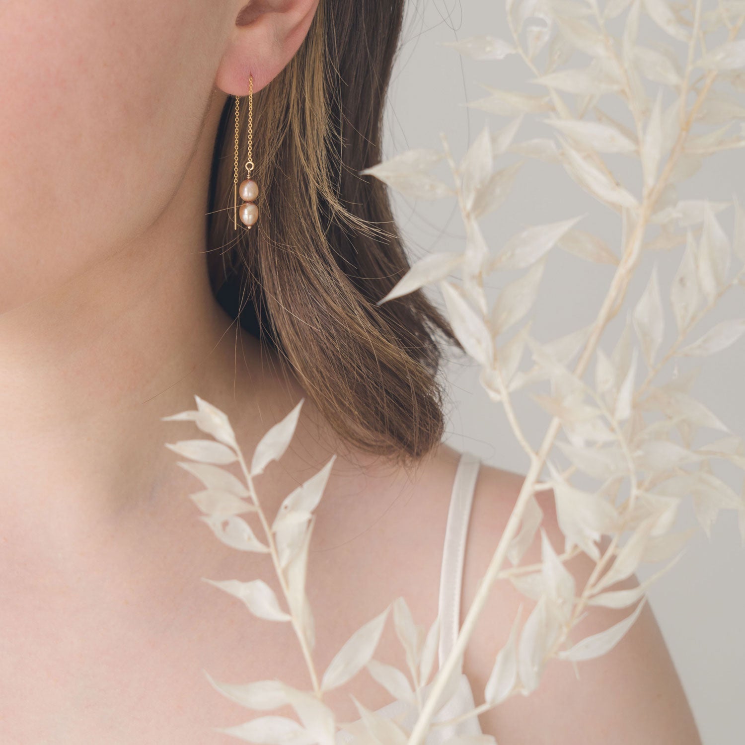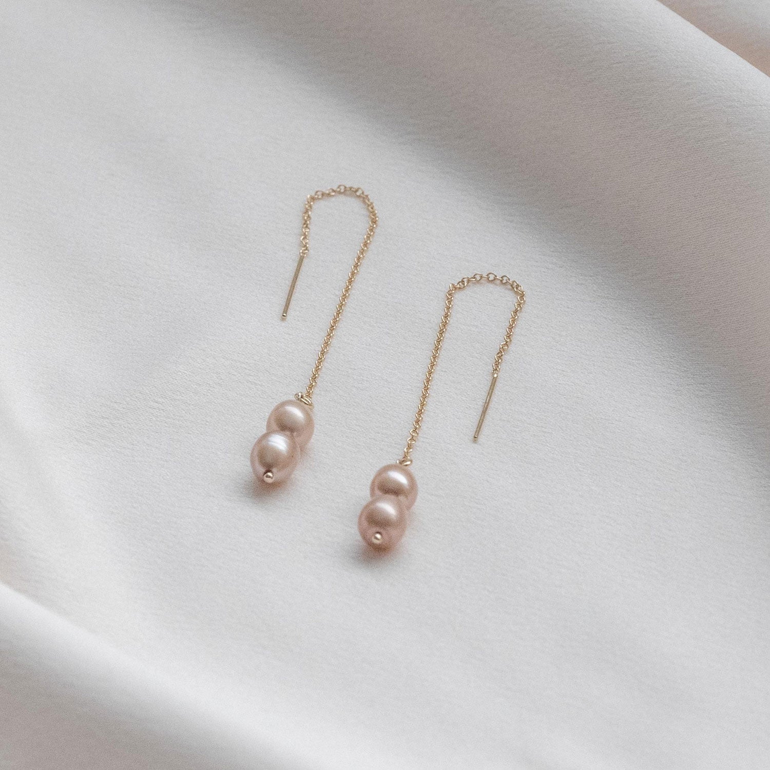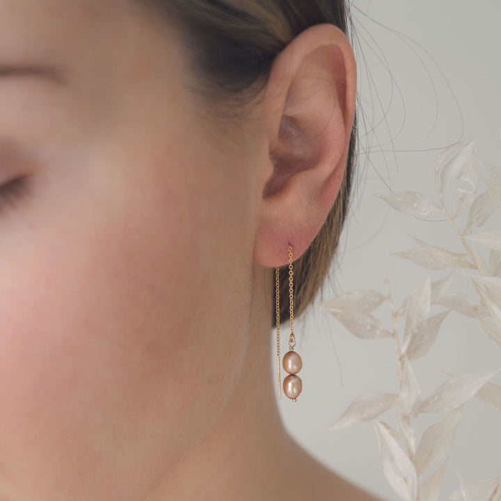 These threaders are made with 14K gold-filled metal and feature freshwater dyed pink champagne pearls.
