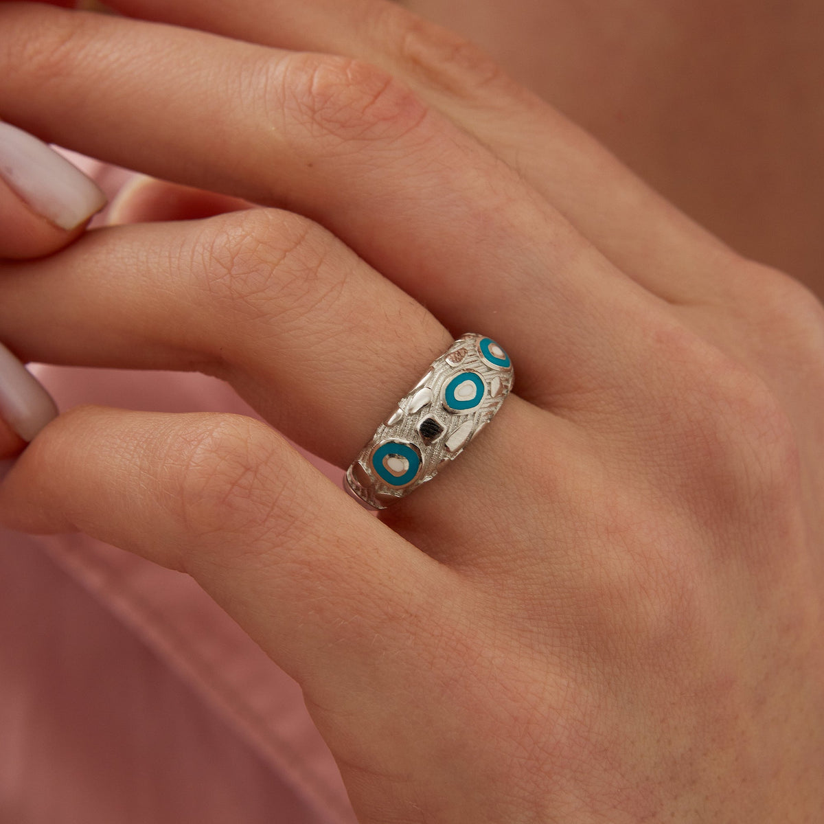 This adjustable ring is crafted from recycled 925 sterling silver, featuring a textured, chunky dome design with an evil eye pattern.