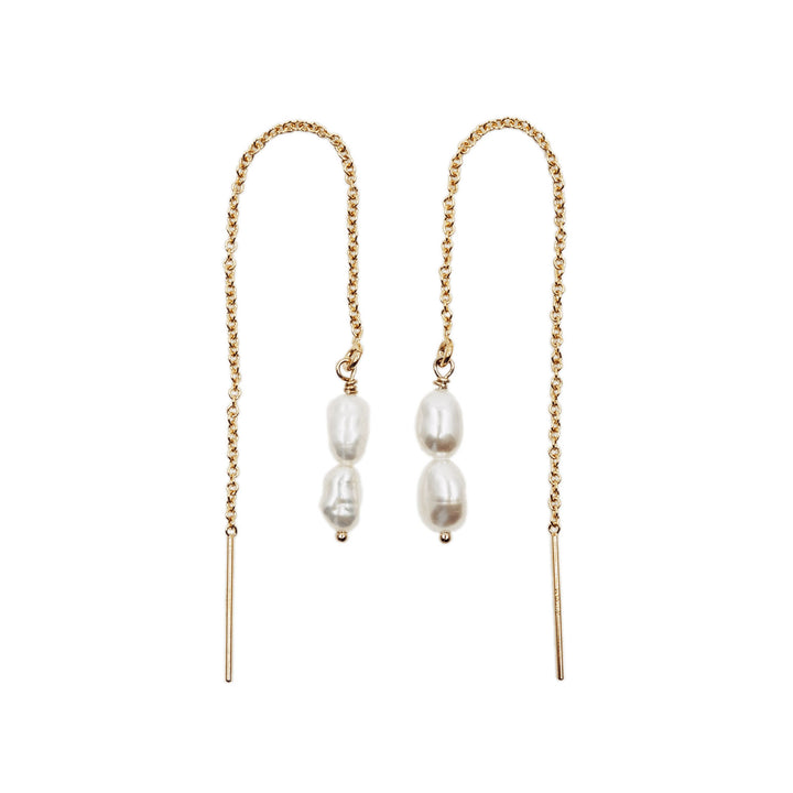 These earrings are made from 14K gold-filled material and feature freshwater white baroque rice pearls.