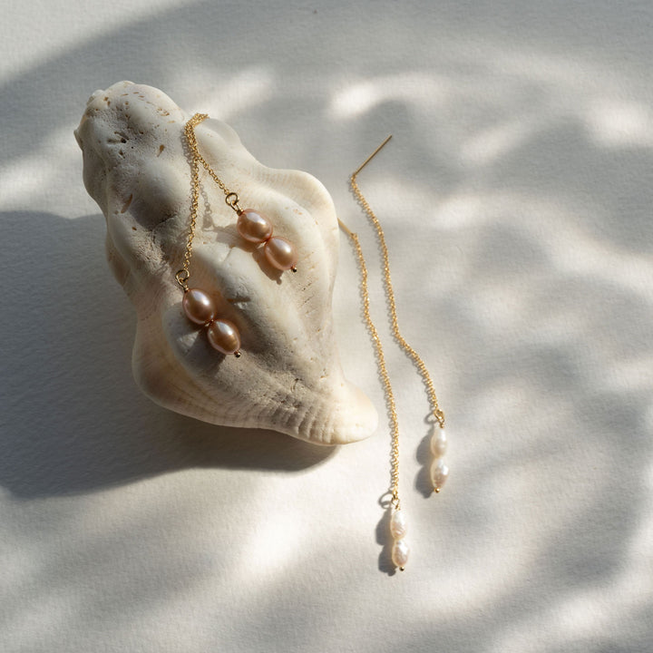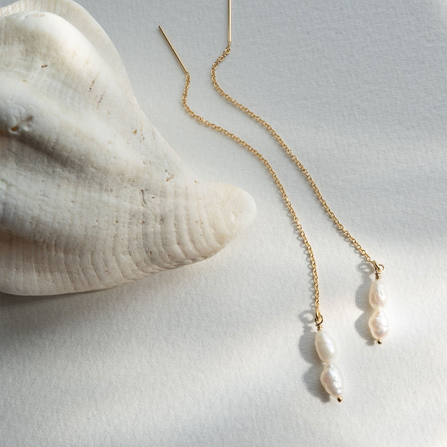 These Classic White Droplet Threaders by Nakiit are an eye-catching and understated alternative to traditional earrings. They feature lustrous white freshwater rice pearls on modern yellow gold threaders, creating a chic and timeless design. Perfect for both casual and formal attire, they are an ideal accessory for brides or bridesmaids who want an easy way to elevate their style with a touch of elegance and radiance.