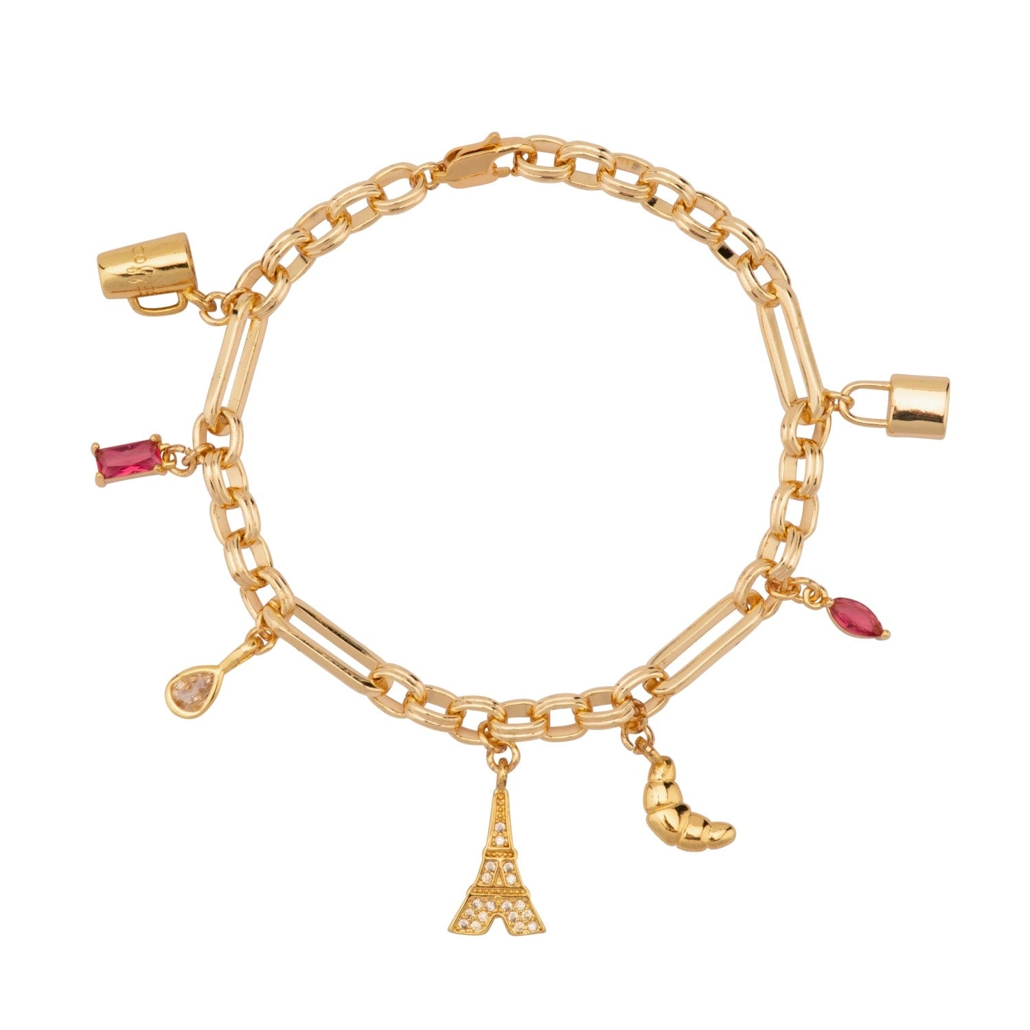 Crafted in 18k gold-plated 304 stainless steel with tarnish-resistant coating. Features seven charms. Bracelet length: 20cm (adjustable). Oval chain 19mm x 6.5mm; round chain 8.5mm x 6.5mm. Nickel- and lead-free.