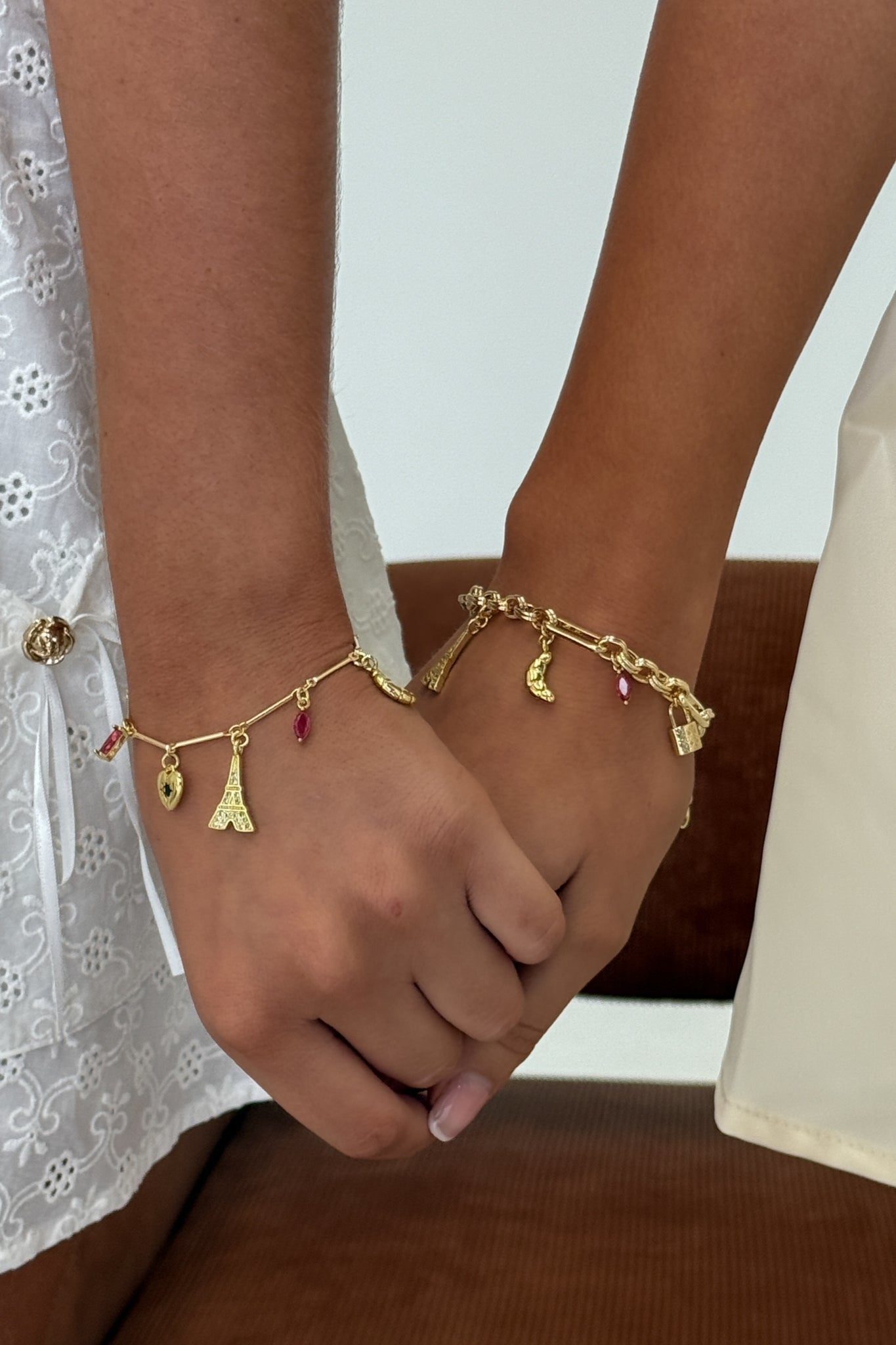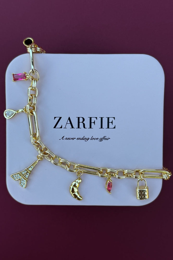 This Chou Chou Charm Bracelet by Zarfie is playful and chic, featuring seven delightful charms that dance along bold chain links. Its whimsical spirit and golden glow make it perfect for layering or wearing solo as a statement. Designed with durability in mind, this bracelet blends charm with everyday wearability, carrying symbolic joy and storytelling through each charm.