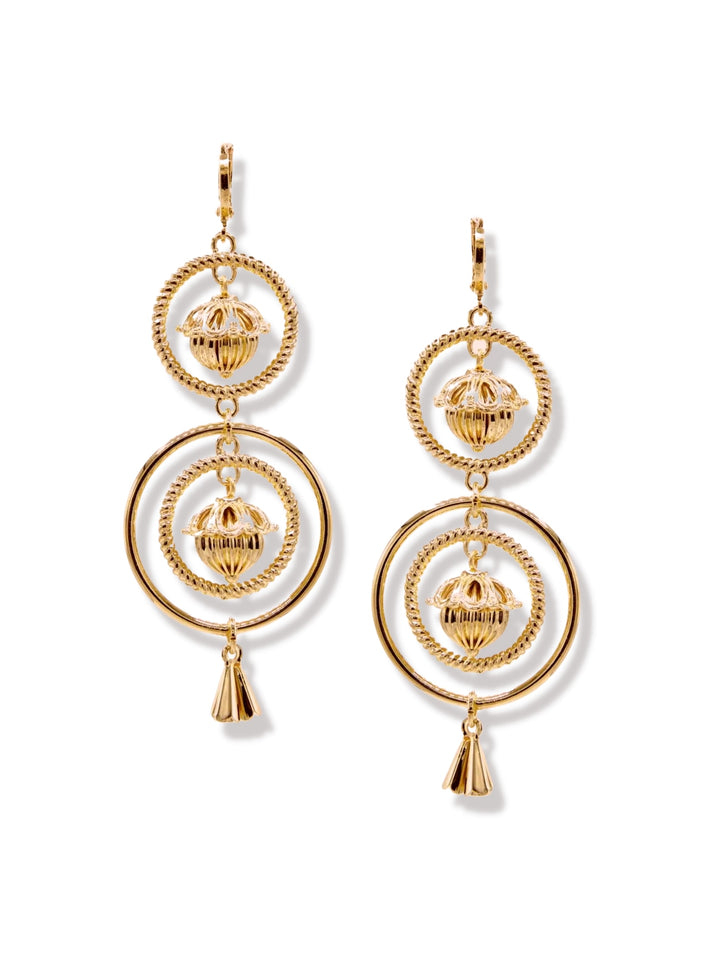 These dangle earrings are embellished with 18K gold plated beads and charms. They are finished with leverback fastenings.