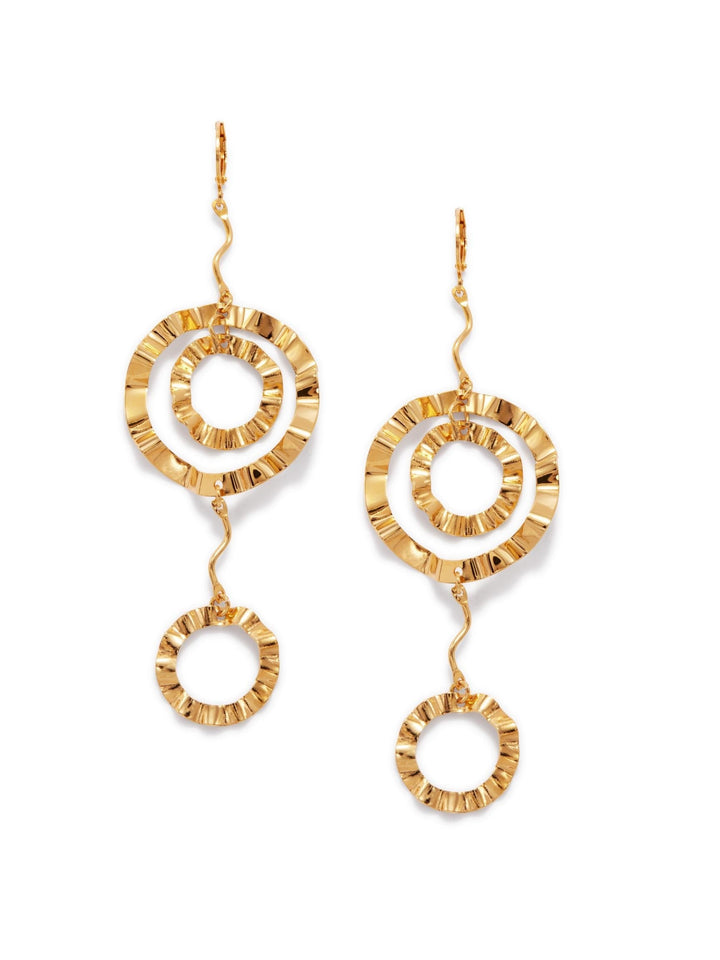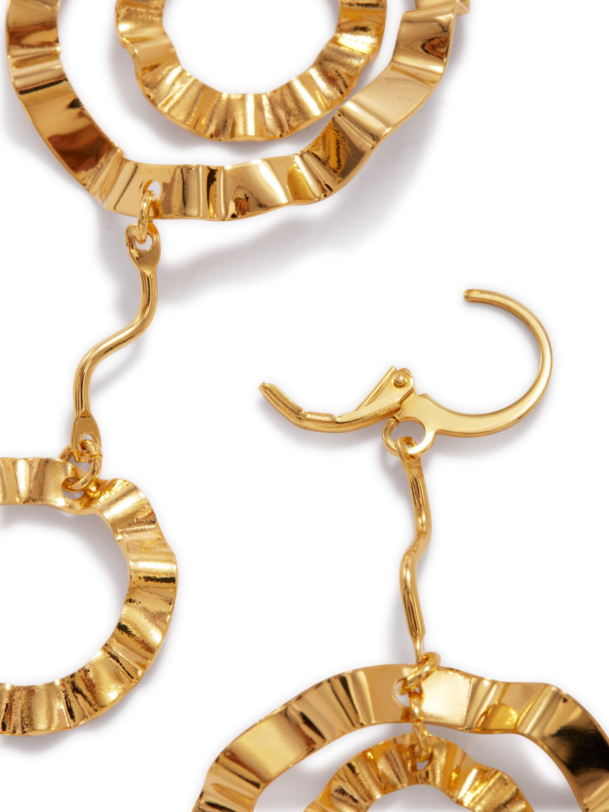 These earrings feature hand-hammered ruffles and are polished in 18K gold plating. They have a leverback fastening and a length of 4 1/4 inches.