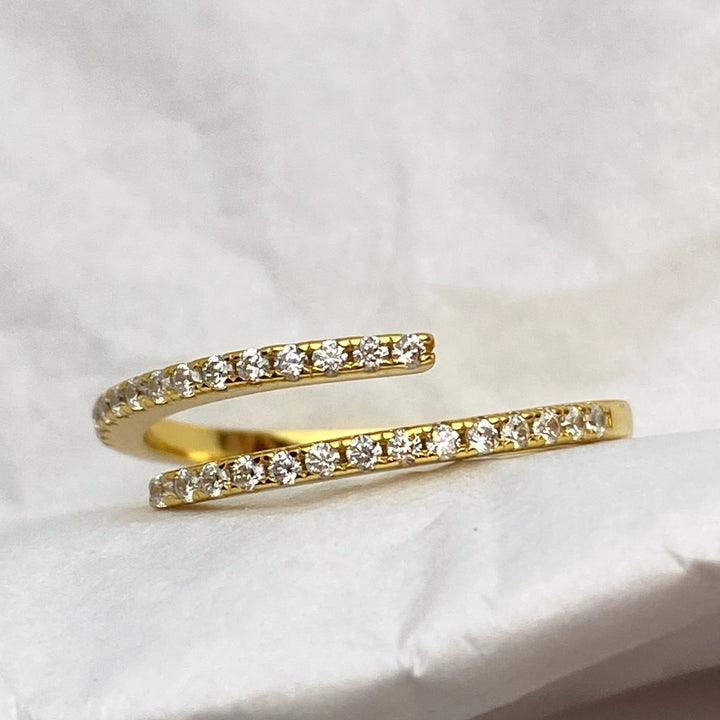 This Pave Claw Double Wrap Adjustable Gold Ring by Nazzar is bold and modern with its claw-inspired silhouette encrusted in sparkling pavé stones. Wrapping elegantly around the finger, it’s adjustable for comfort and impact—an empowering accessory that balances strength with glamour.