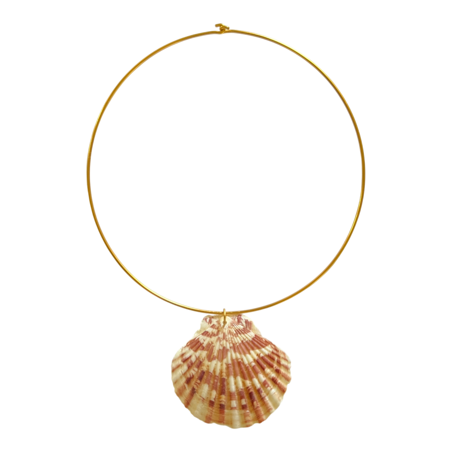 This necklace is a 17-inch collar featuring an oversized pink and white striped seashell.