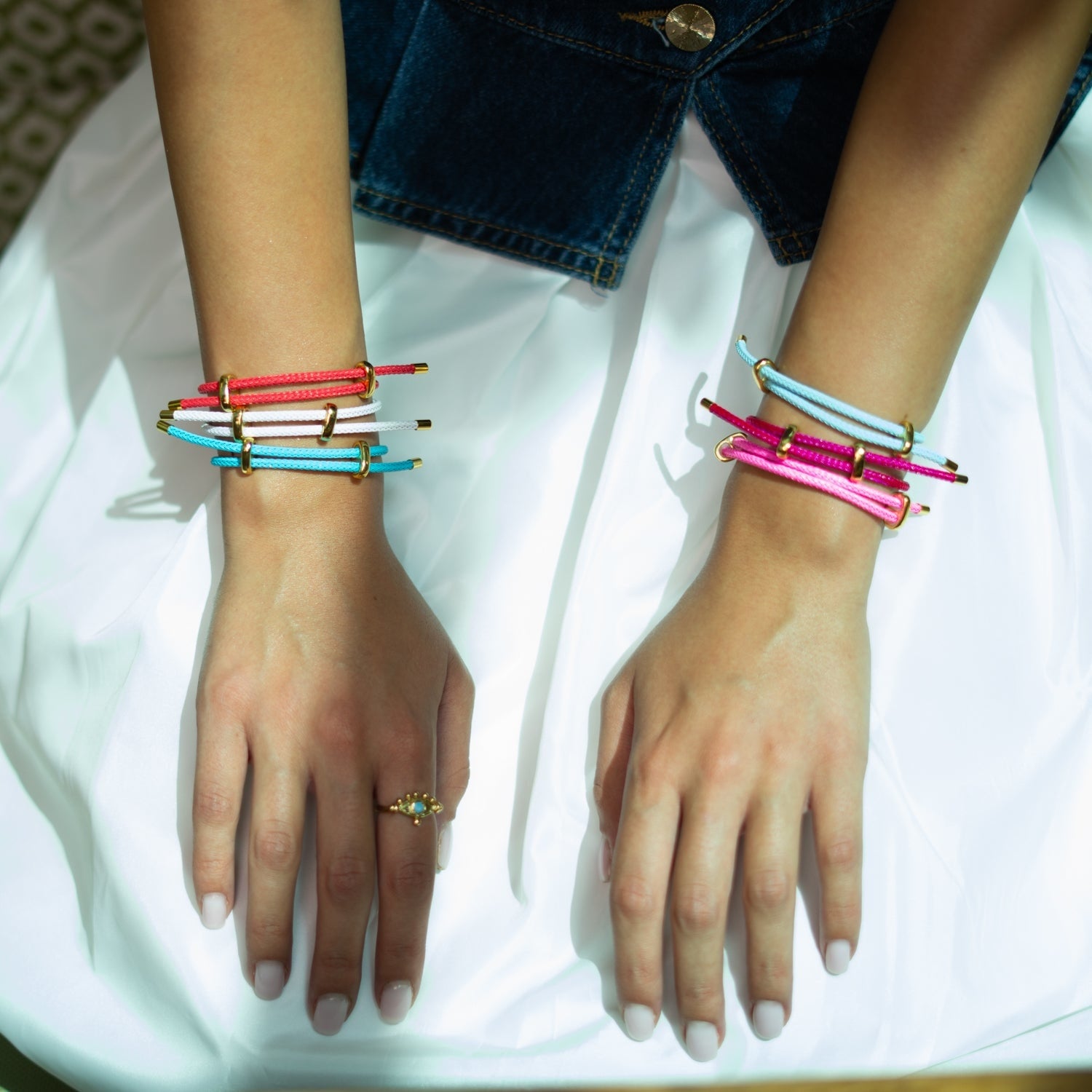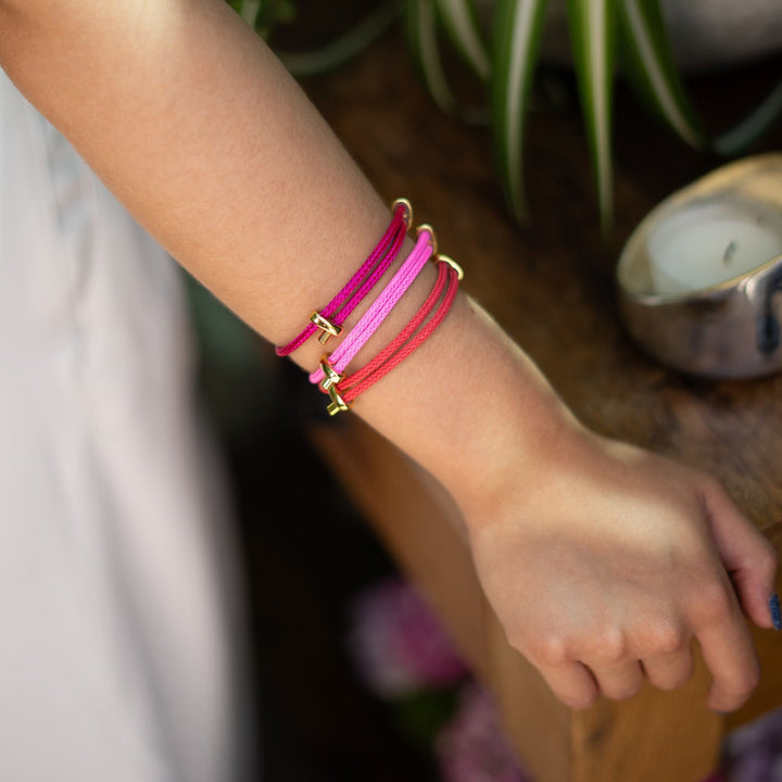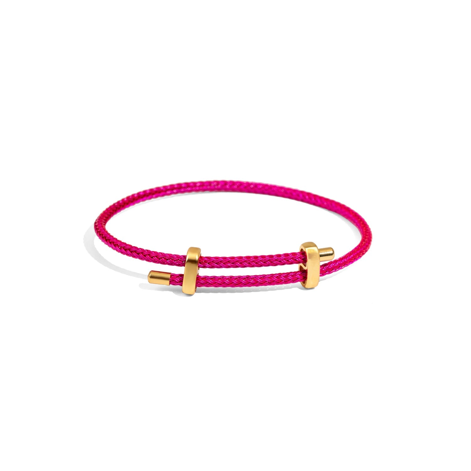 Durable fuchsia rope with 18k gold-plated stainless steel accents. Adjustable fit. Available in 8 color variations.
