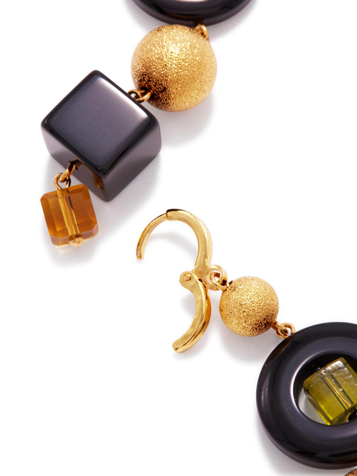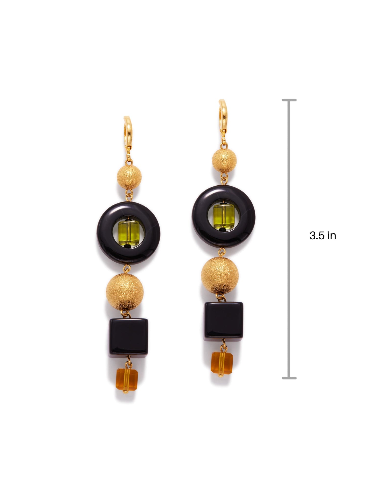Made with 18K gold-plated leverback hooks. Designed with geometric glass beads in amber, green, and black hues. Drop length: 3.5 inches.