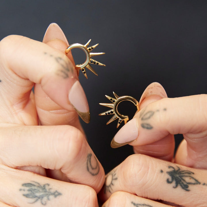 These Gold Black Sun Spike Hoop Earrings by Scream Pretty are an edgy and rebellious accessory perfect for channeling your inner rock star. Crafted from sterling silver with 18-karat gold plating, the earrings feature sun rays adorned with black cubic zirconia stones that extend from a sleek hoop base. Their bold and rebellious design adds a touch of western gothic flair to your everyday style. This piece is perfect for those who want to make a statement and stand out from the crowd.