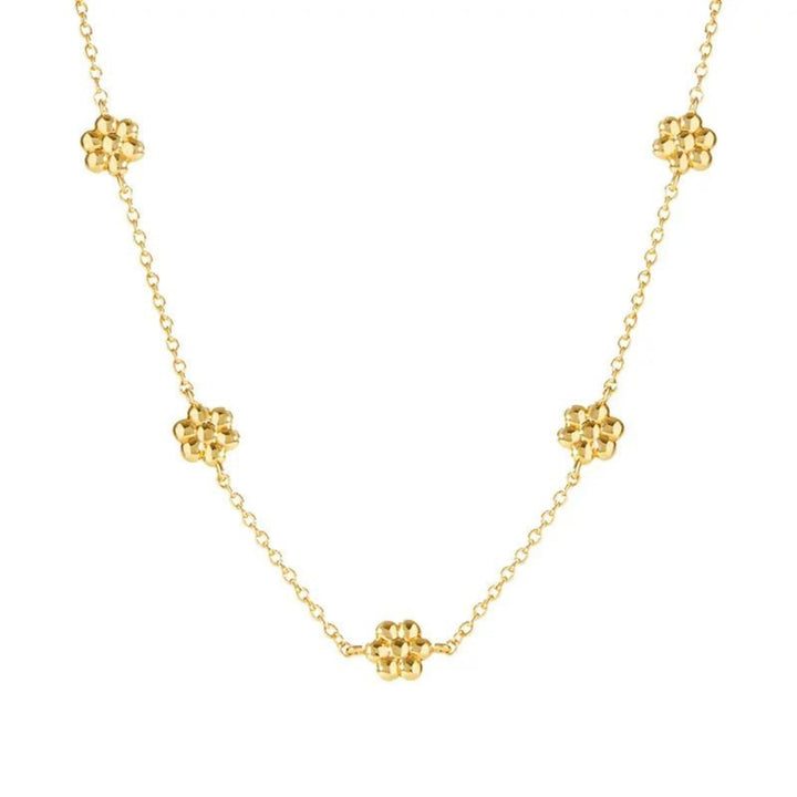 This Gold Daisy Flower Station By The Yard Necklace by Nazzar is a delightful adornment that radiates charm and grace. The intricately crafted daisy pendants are a testament to nature's delicate beauty. This necklace is waterproof, tarnish-free, and hypoallergenic, ensuring lasting quality. It is a timeless accessory that celebrates life's simple pleasures and is sure to enchant admirers with its whimsical allure.