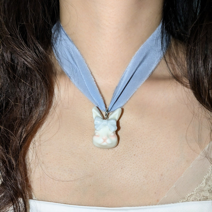 The Grumpy Bunny Baby Blue Silk Choker Necklace by H2 Studio is an artistic accessory with a powerful message. It features a unique porcelain pendant of a rabbit with forward-pointed ears, a subtle sign of frustration in nature. The piece is a metaphor for the silent anger and struggles of women whose feelings are often dismissed. The pendant is attached to a 100% silk necklace, creating a bold choker that gives a voice to those who are often underestimated.