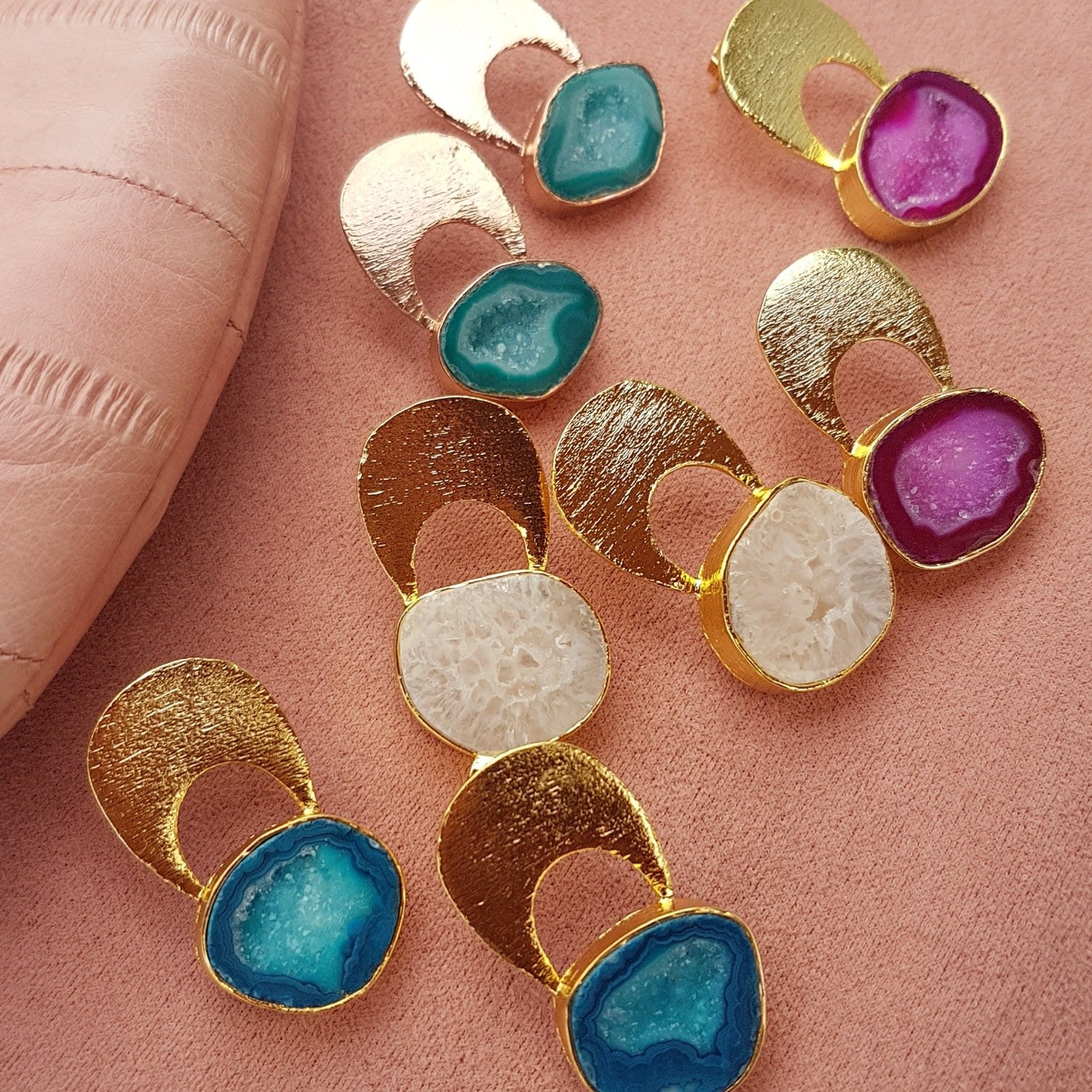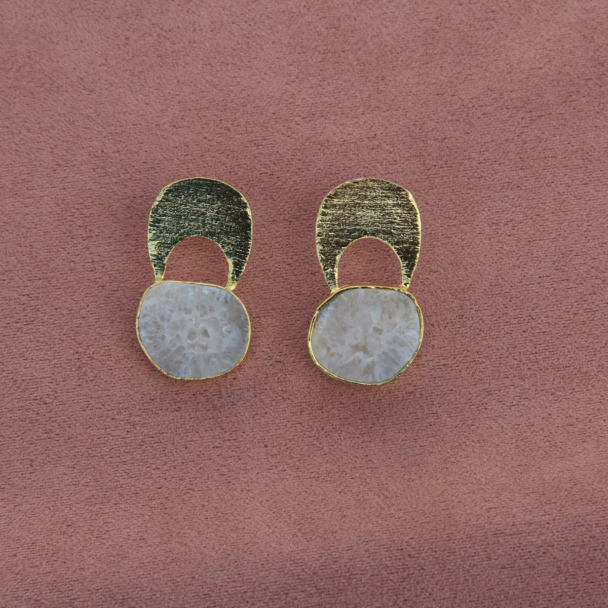 Handcrafted in Brass with 18K Gold plating. Features natural White Agate crystals. Each pair varies in shape and colour.
