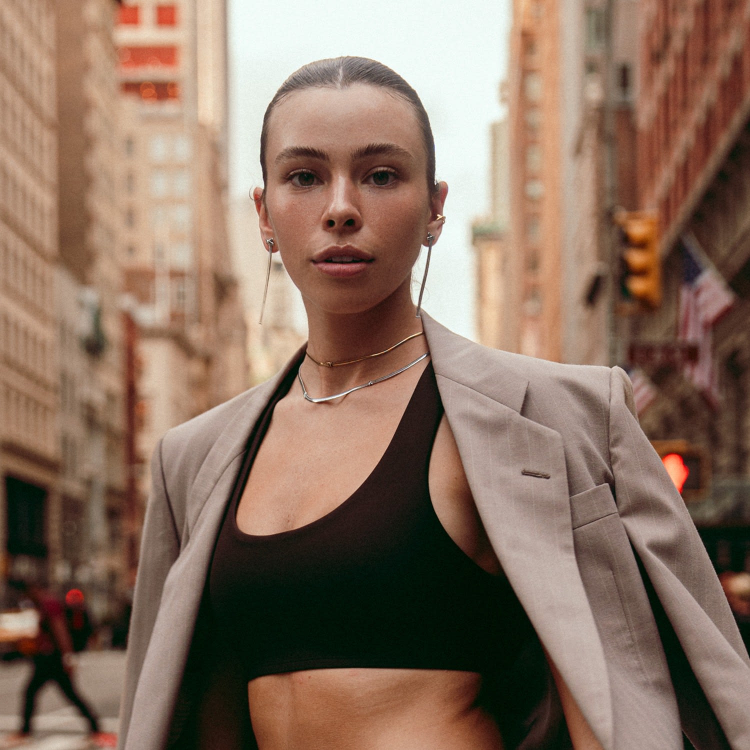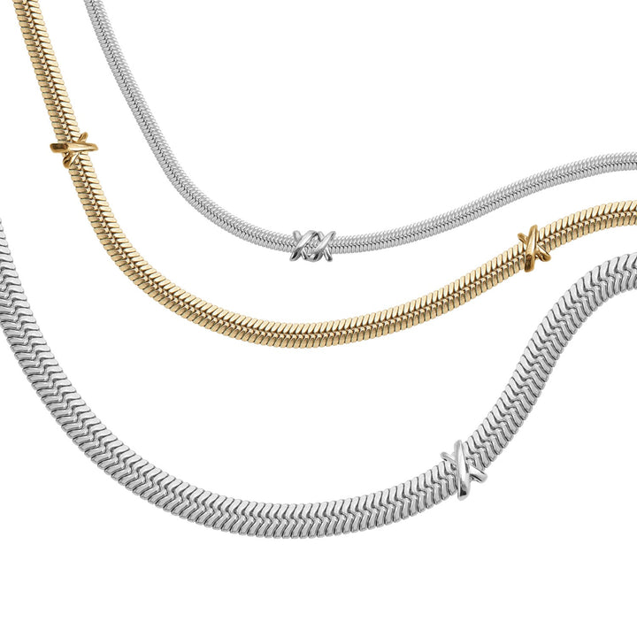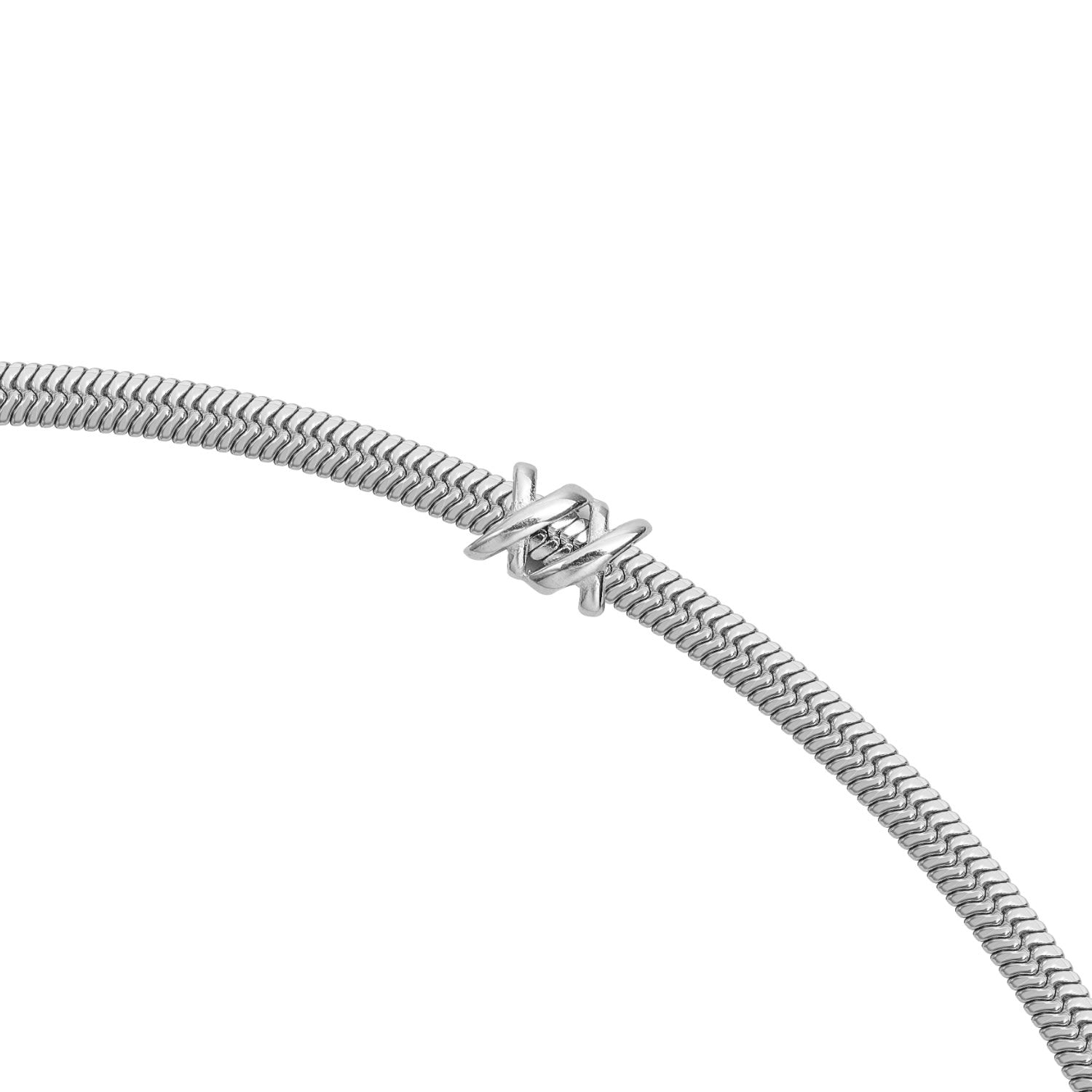 The Minimalism Boa Snake Chain Necklace S in Silver by Me30 blends sleek design with symbolic strength. The snake chain lies comfortably against the skin, with the “X” detail representing life’s unknown codes. Its versatile length makes it ideal for layering or solo wear.