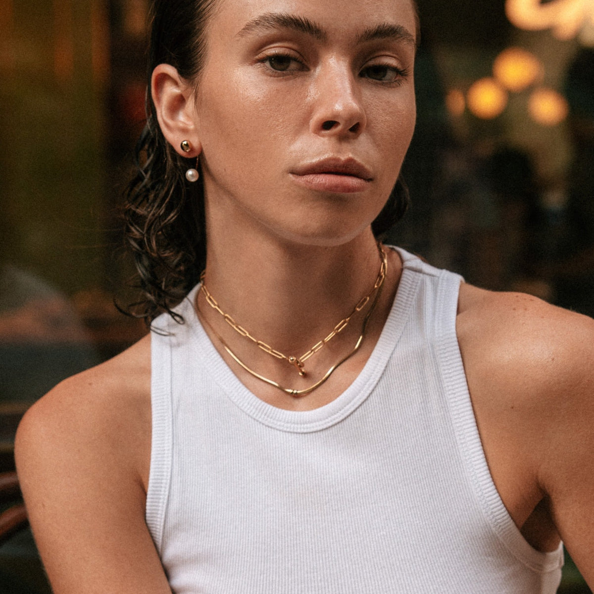 Crafted in 316L hypoallergenic stainless steel with PVD 18k gold plating. Measures 37 cm with 5 cm extender. Fishtail clasp.