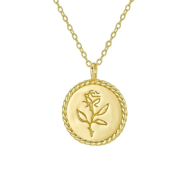 The Gold Coin Flower Pendant Necklace by Nazzar is a versatile accessory that blends vintage charm with modern elegance. It features an intricately detailed rose emblem etched onto a classic coin pendant. The necklace is made with a 100% recycled sterling silver base and a thick layer of high-quality 14k gold plating. It is waterproof, tarnish-free, sweatproof, and hypoallergenic.