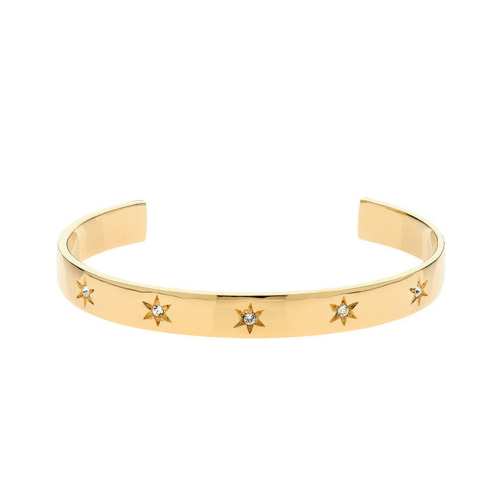 This cuff is gold-plated, studded with crystals, and embossed with a star design. It measures 5.5cm in width.