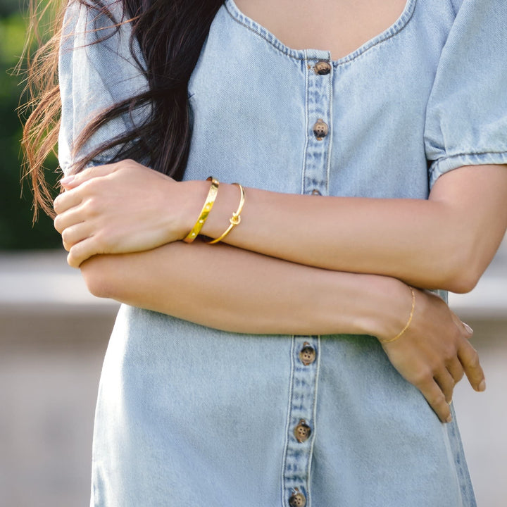 This Gold & Crystal Star Cuff by Emma Holland Jewellery is a gorgeous and versatile piece that adds a touch of celestial sparkle to your wrist. This gold-plated cuff is studded with crystals and embossed with a star design, creating a confident and luxurious statement. It's the perfect accessory to wear alone for a polished look or stack with other bracelets to create a personalized style.
