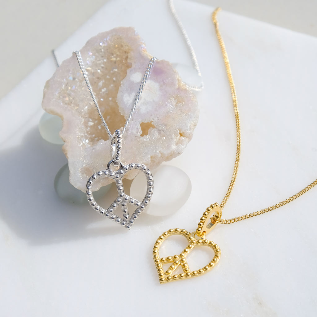 This Peace Heart Silver Pendant Necklace by Charlotte's Web Jewellery is a meaningful and deeply personal accessory designed to manifest inner peace and unconditional love. Fusing the iconic symbols of the heart and the peace sign, this handcrafted silver pendant offers a beautiful message of harmony and tranquility. Its versatile design allows it to be worn as a solo statement or layered with other chains for a bohemian-chic look. You can also personalize it with your chosen birthstone for a one-of-a-kind piece.