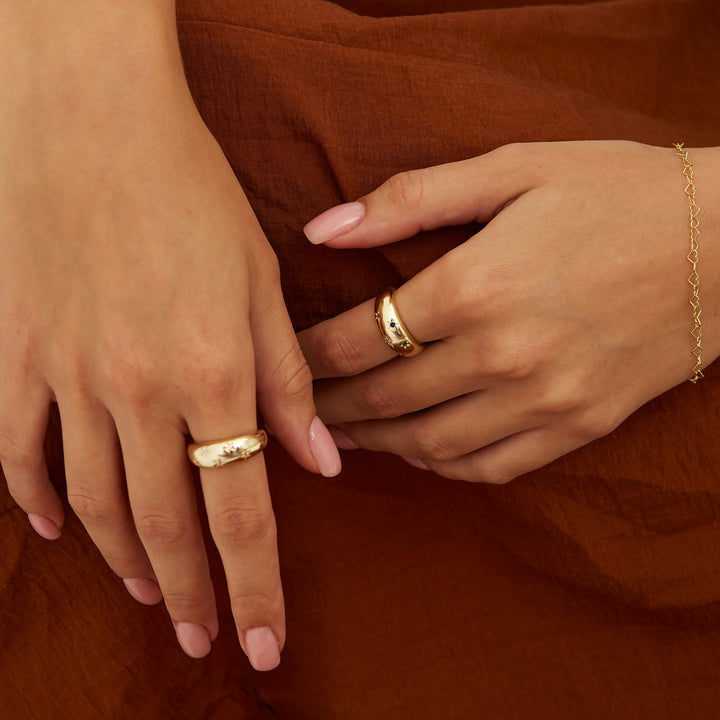 A handcrafted ring made from 925 recycled sterling silver. It features a chunky dome design adorned with star stamps and gleaming zircons.