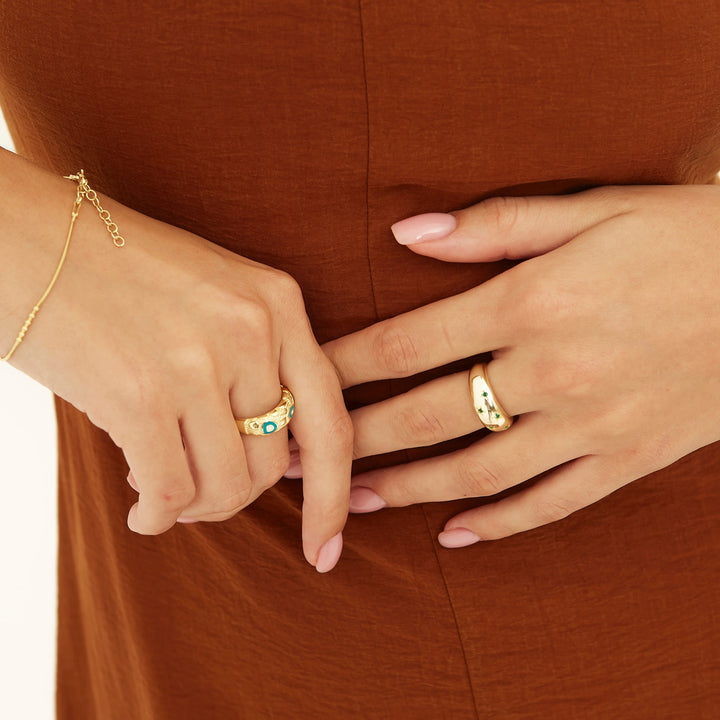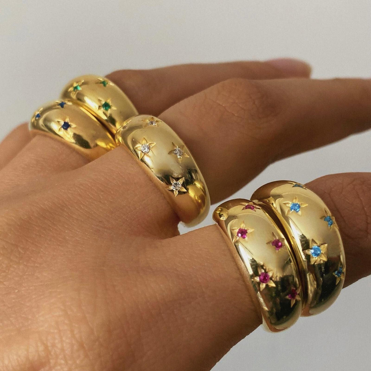 This Celestial Star Sterling Silver Dome Ring With Green Gemstones by Spero London is a bold yet elegant statement piece designed to elevate your everyday style. Crafted from 925 recycled sterling silver, this dome ring features delicate, intricately stamped stars adorned with sparkling cubic zirconia. Its adjustable design ensures a perfect fit for any finger, allowing for a chic stacked look. This versatile piece, with its luxurious gold tone and green, white, pink, and multicolor accents, is perfect for a refined touch or for layering to create a captivating look.