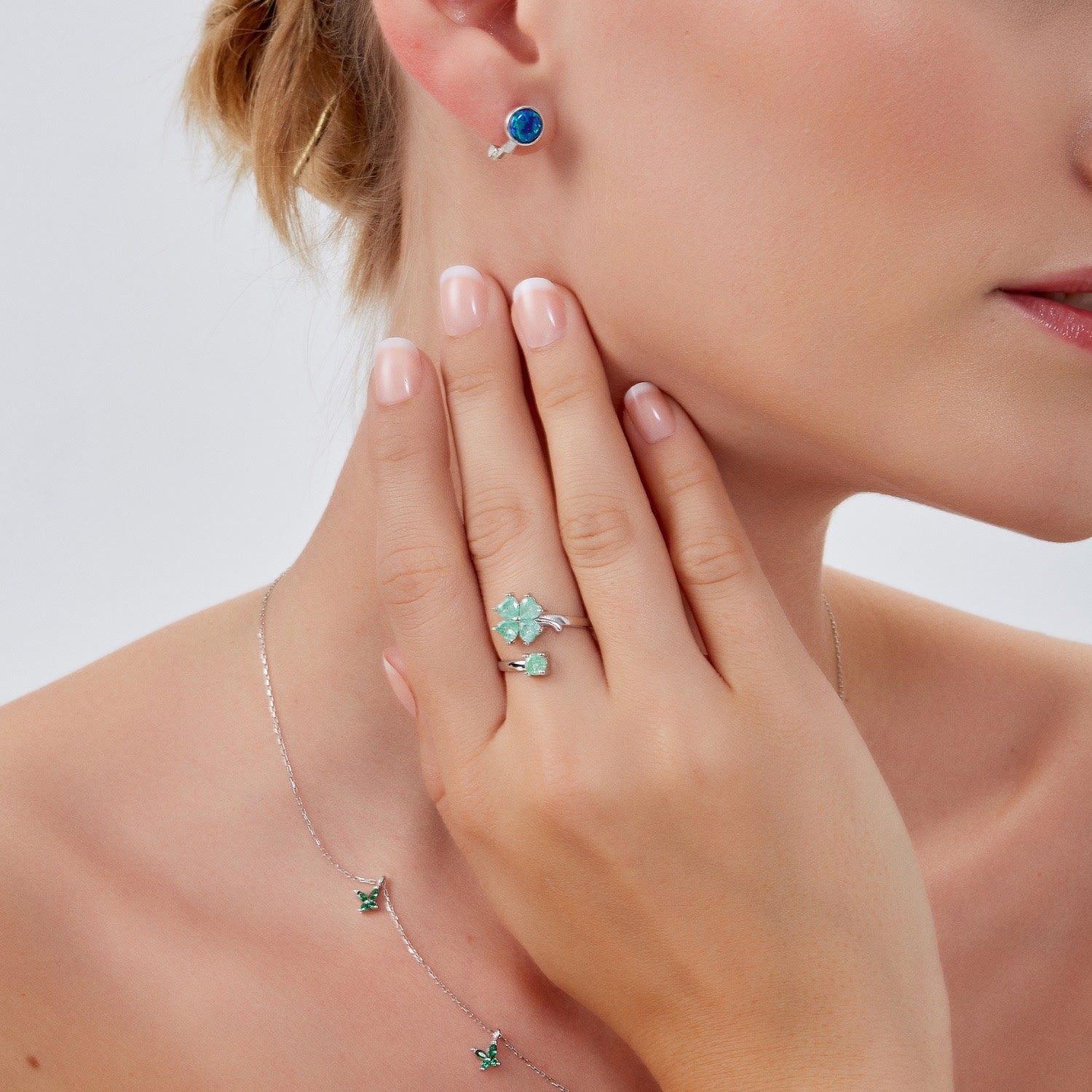 This ring is crafted from sterling silver and features a green four-leaf clover design.