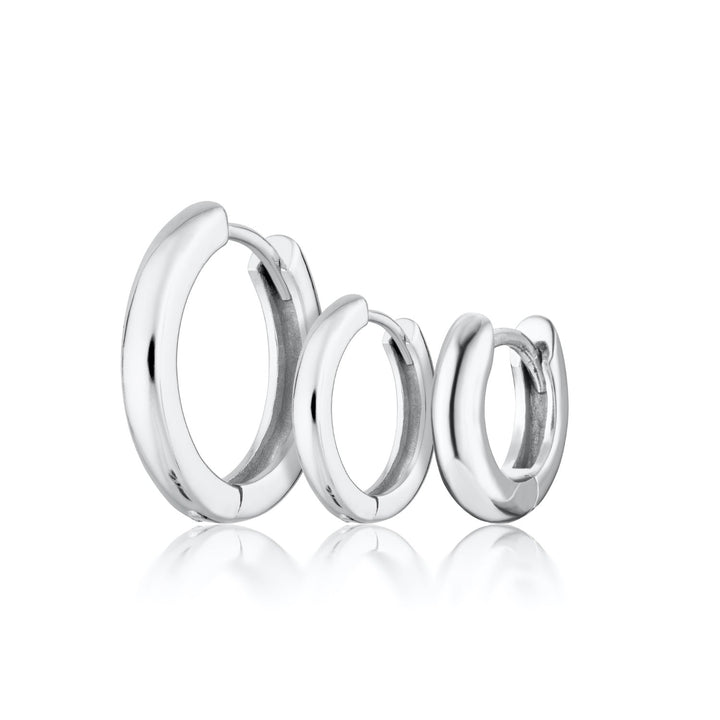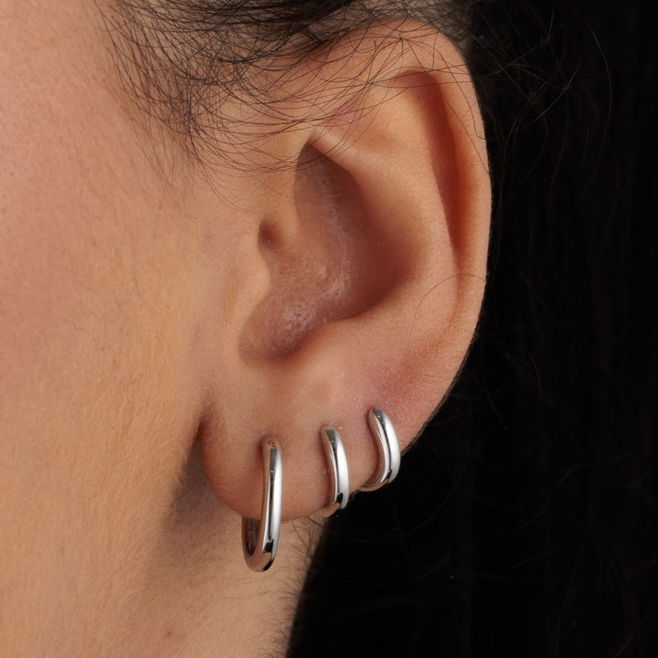 This set includes three huggie hoops in graduated sizes. They are crafted from 100% recycled sterling silver with rhodium plating.