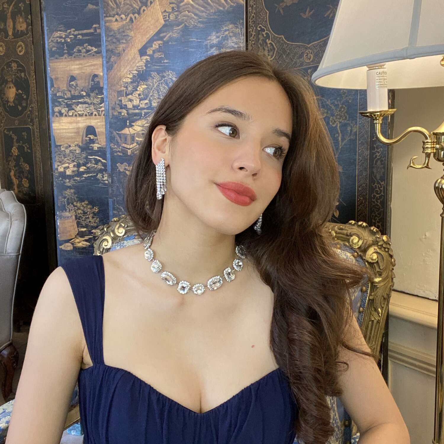This necklace is crafted with crystal glass stones and a silver plate setting. It comes with a velvet pouch and should be cleaned with a dry cloth.