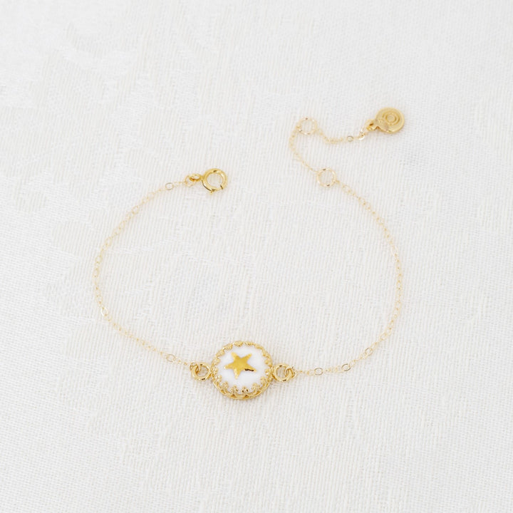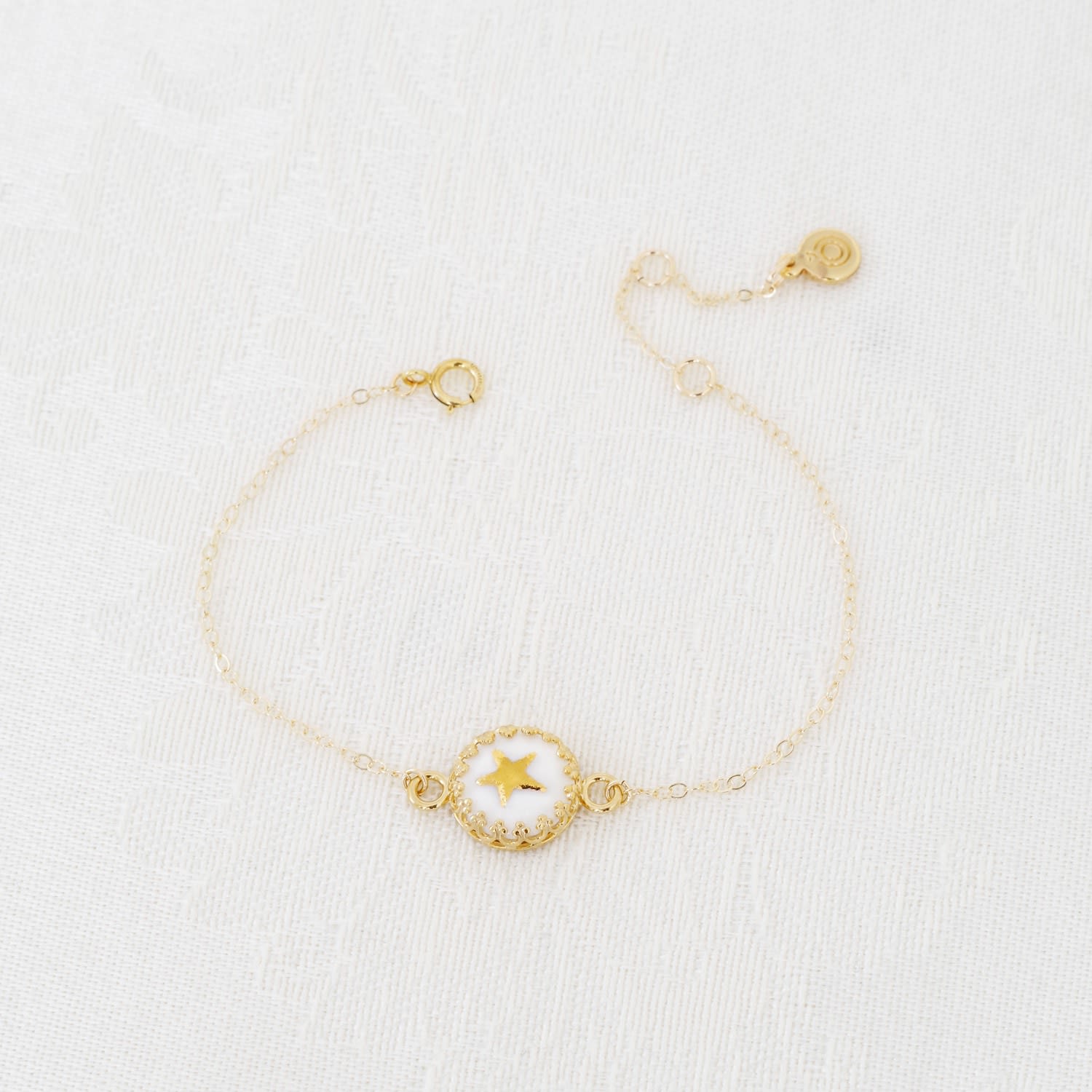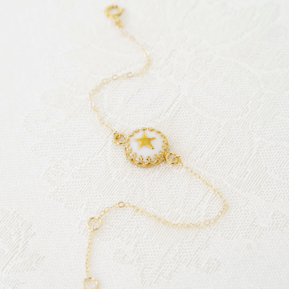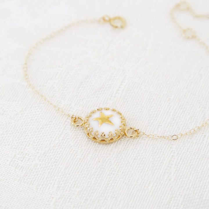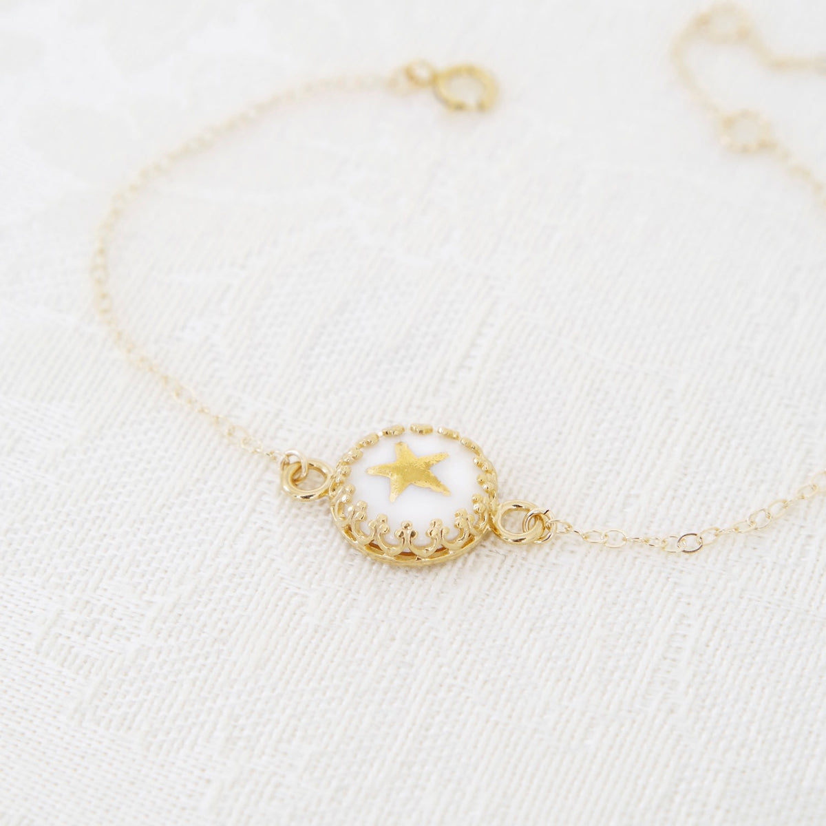 This bracelet features a handmade porcelain cabochon with a gold luster star and a gold-plated bezel. The chain and clasp are 14K gold-filled.