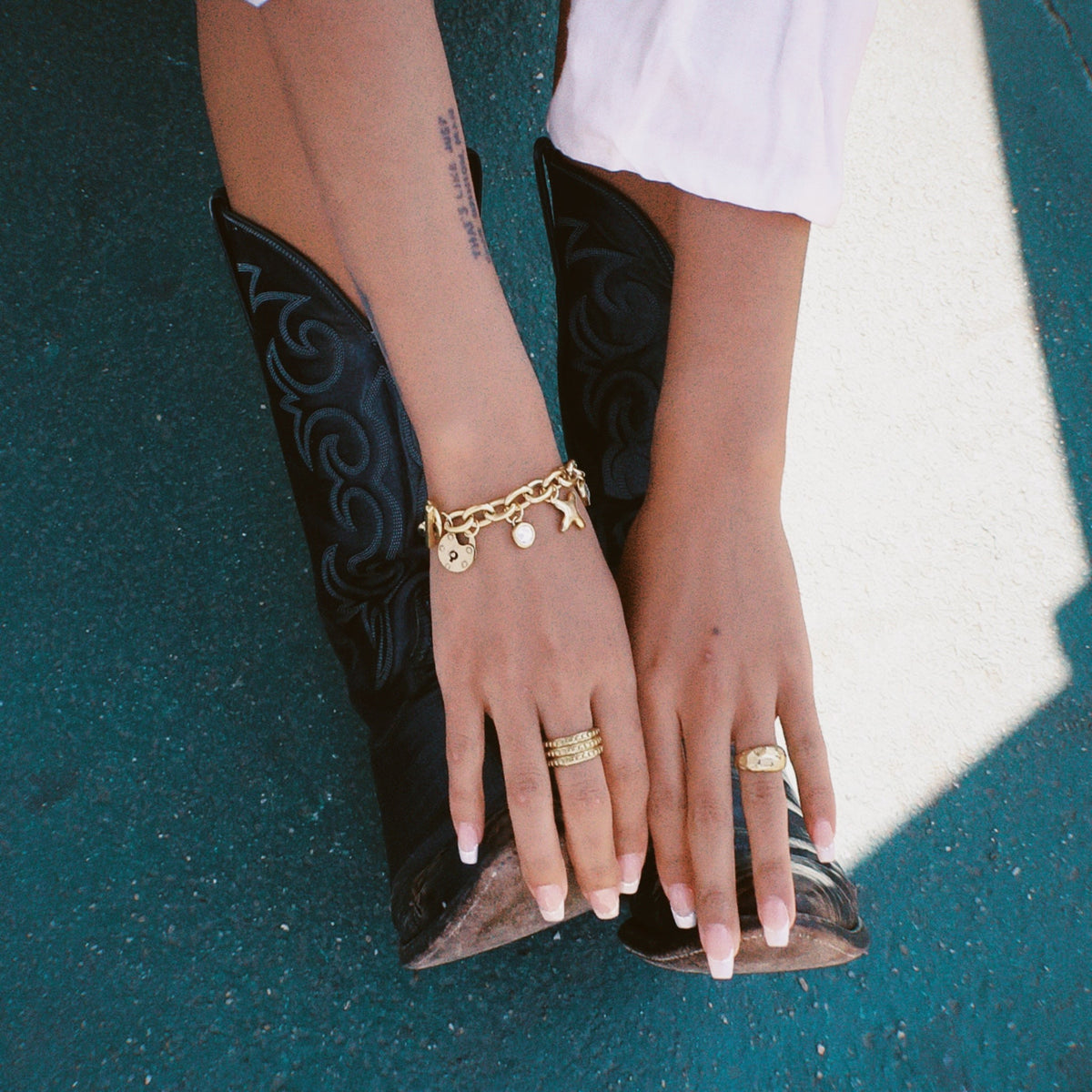 This Graziella Gold Chunky Charm Bracelet by Sccollection is a glitzy and glamorous accessory that's giving "extra" in the best way. The chunky 12k antiqued gold-plated stainless steel chain is adorned with an assortment of handcrafted charms, including rhinestones, to elevate any look. The mini toggle clasp makes it easy to put on and take off, making it a perfect statement piece.