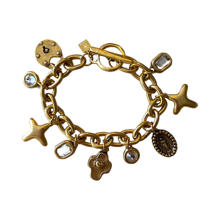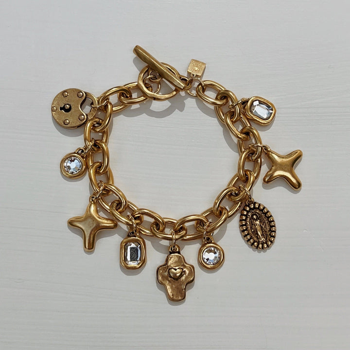 This 7.5-inch chunky charm bracelet is made from 12k antiqued gold-plated stainless steel and features handcrafted 12k antiqued gold-plated pewter and rhinestone charms. It has a mini toggle clasp.