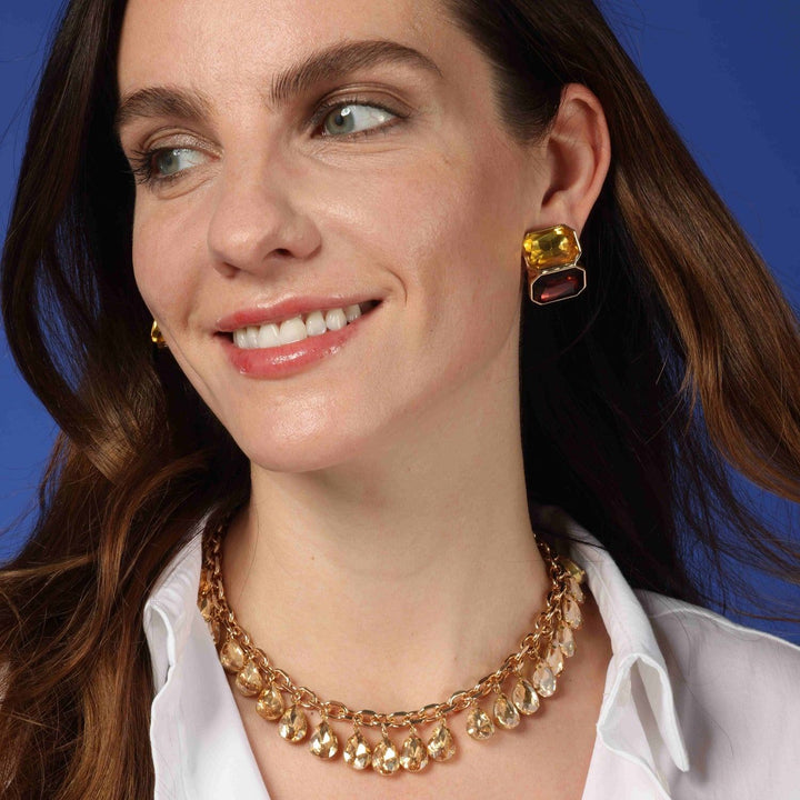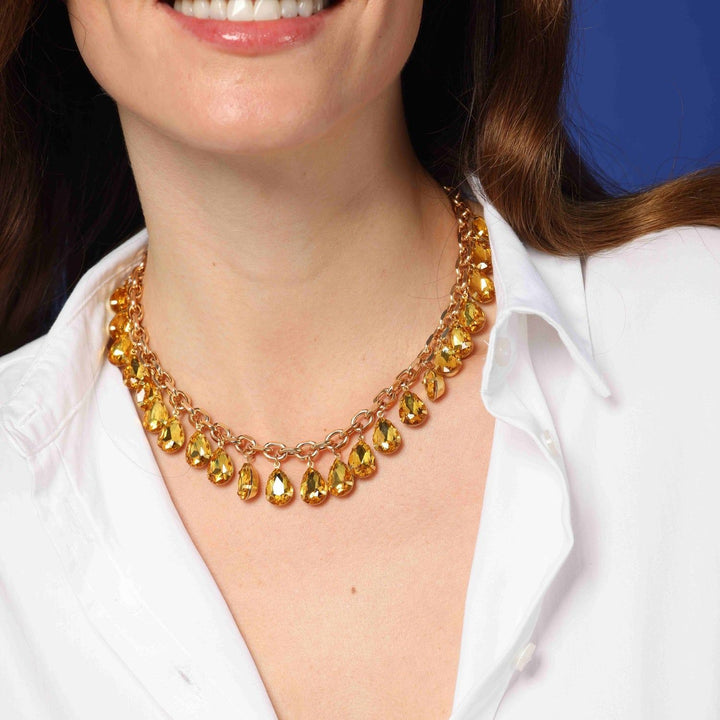 A necklace with shimmering topaz crystals and gold plating. The chain is 14.5 inches long with a 3.5-inch extender.